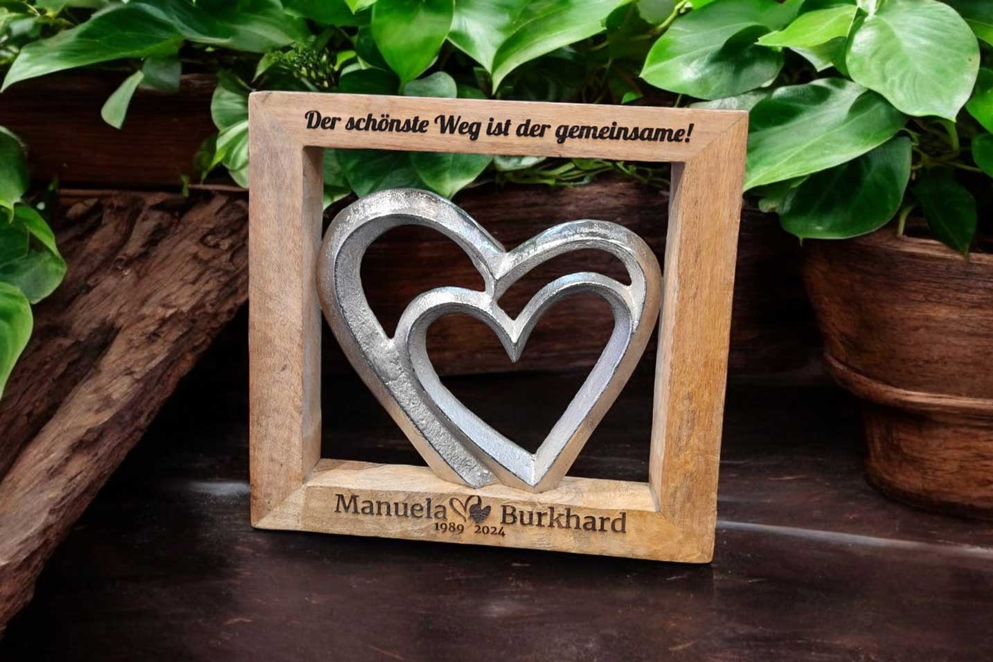 nehmen einen besondern Stellenwert ein. Die Hochzeitsgeschenke bleiben dem Brautpaar oft ein Leben lang im Gedächtnis. Deshalb sollte das Geschenk zur Hochzeit auch wohl überlegt sein. Besonders beliebt sind Präsente, die das Thema Liebe und Hochzeit aufgreifen. Unvergessliche Geschenke entstehen auch dadruch, dass sie um persönliche Bilder, Anekdoten und Wünsche ergänzt werden. Moderne Bilderrahmen mit Fotos das Brautpaars oder DIY Geschenke, die individuell mit Wünschen beschriftet werden können und sich auch wunderbar als Gruppengeschenk eignen.Oder verschenken Sie ein Gästebuch. So entsteht während der Hochzeitsfeier selbst ein unvergessliches Erinnerungsstück. Dies kann das klassische Hochzeitsgästebuch sein oder eine moderne Alternative. Wie wäre es zum Beispiel mit einem Gästebuch aus Holz, welches später dekorativ an der Wand seinen Platz finden kann?
