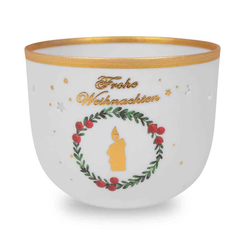 Heimeliges Licht verbreiten die Adventsbecher aus Porzellan mit kleinen Stern-Ausstanzungen. Mit Goldrand und Golddekor "Frohe Weihnachten".