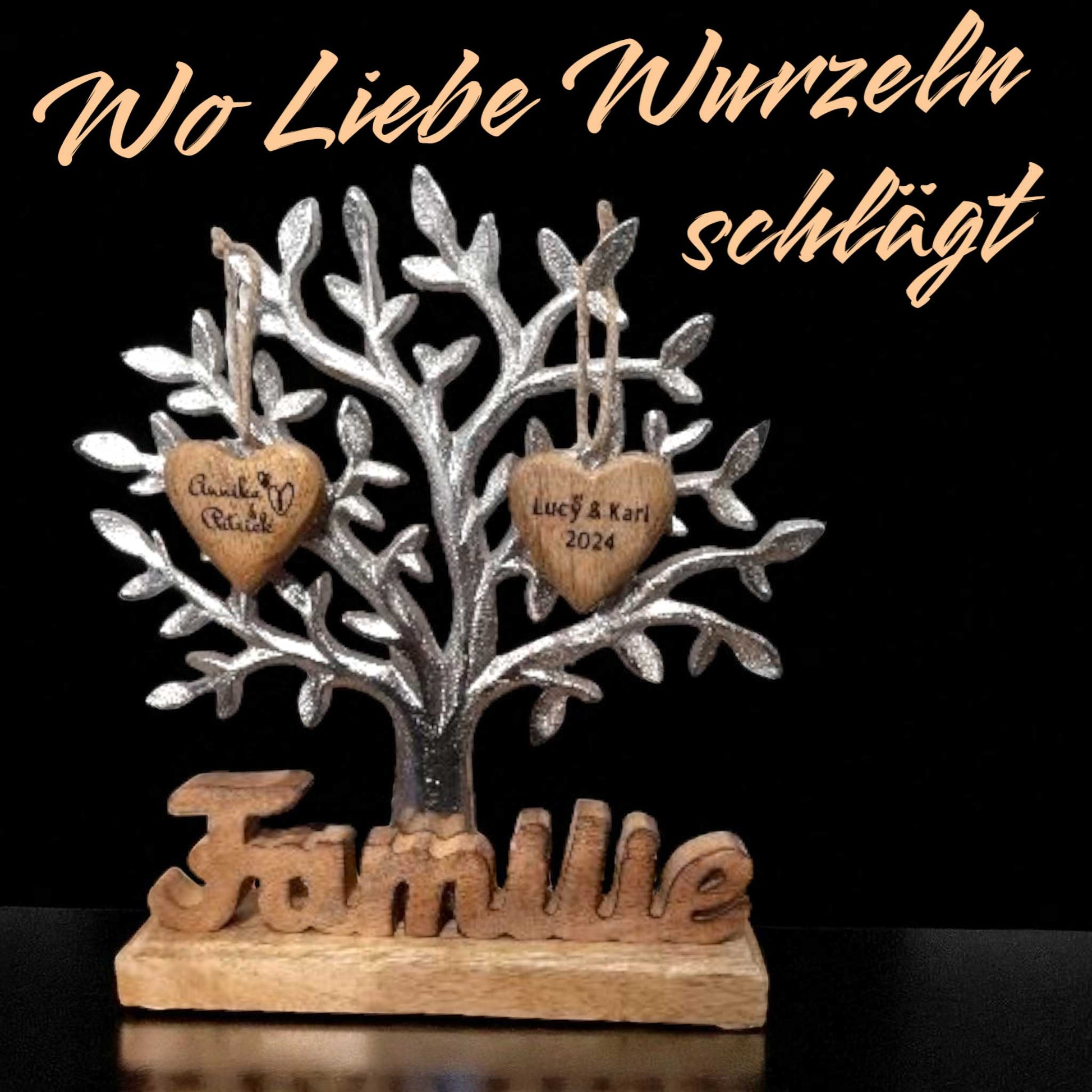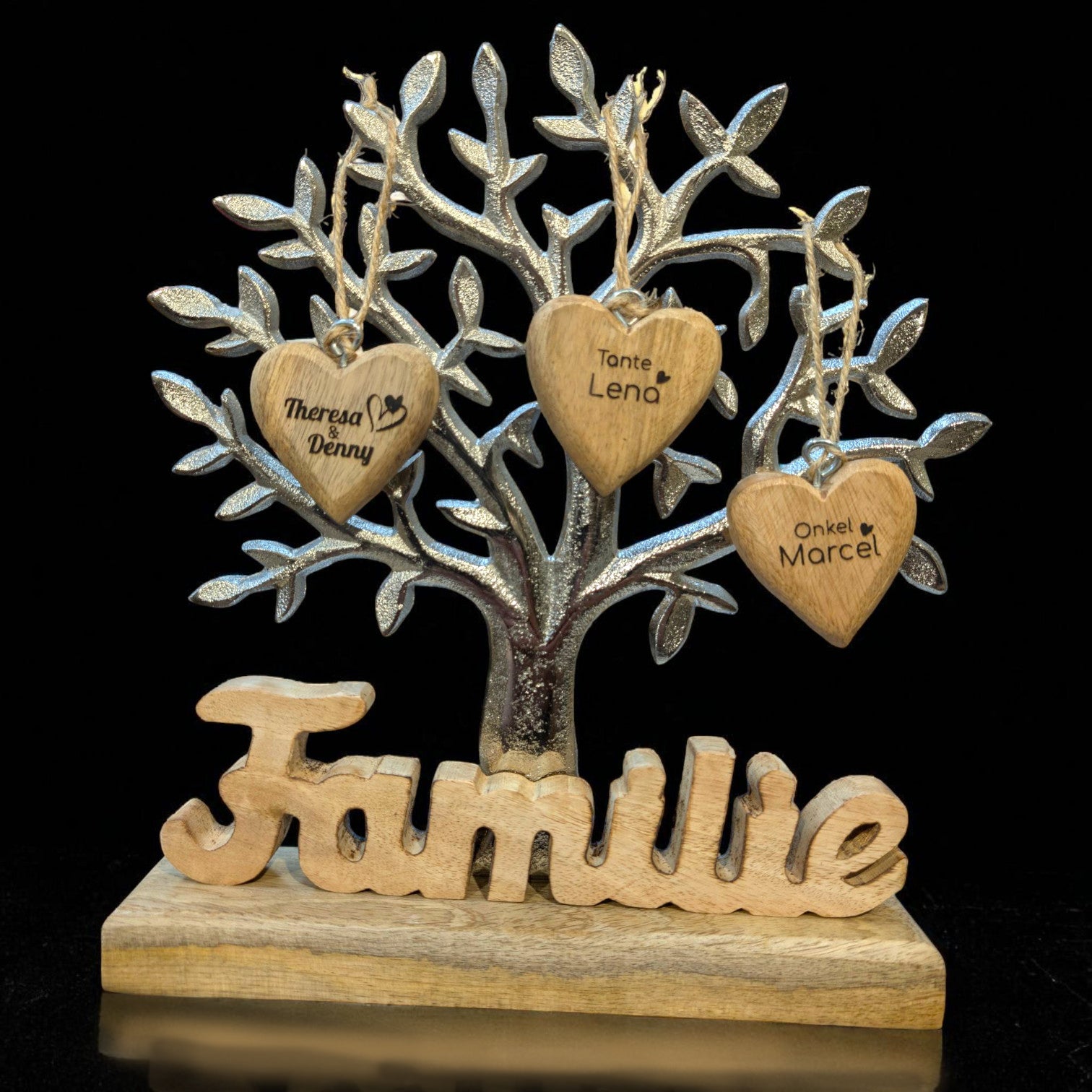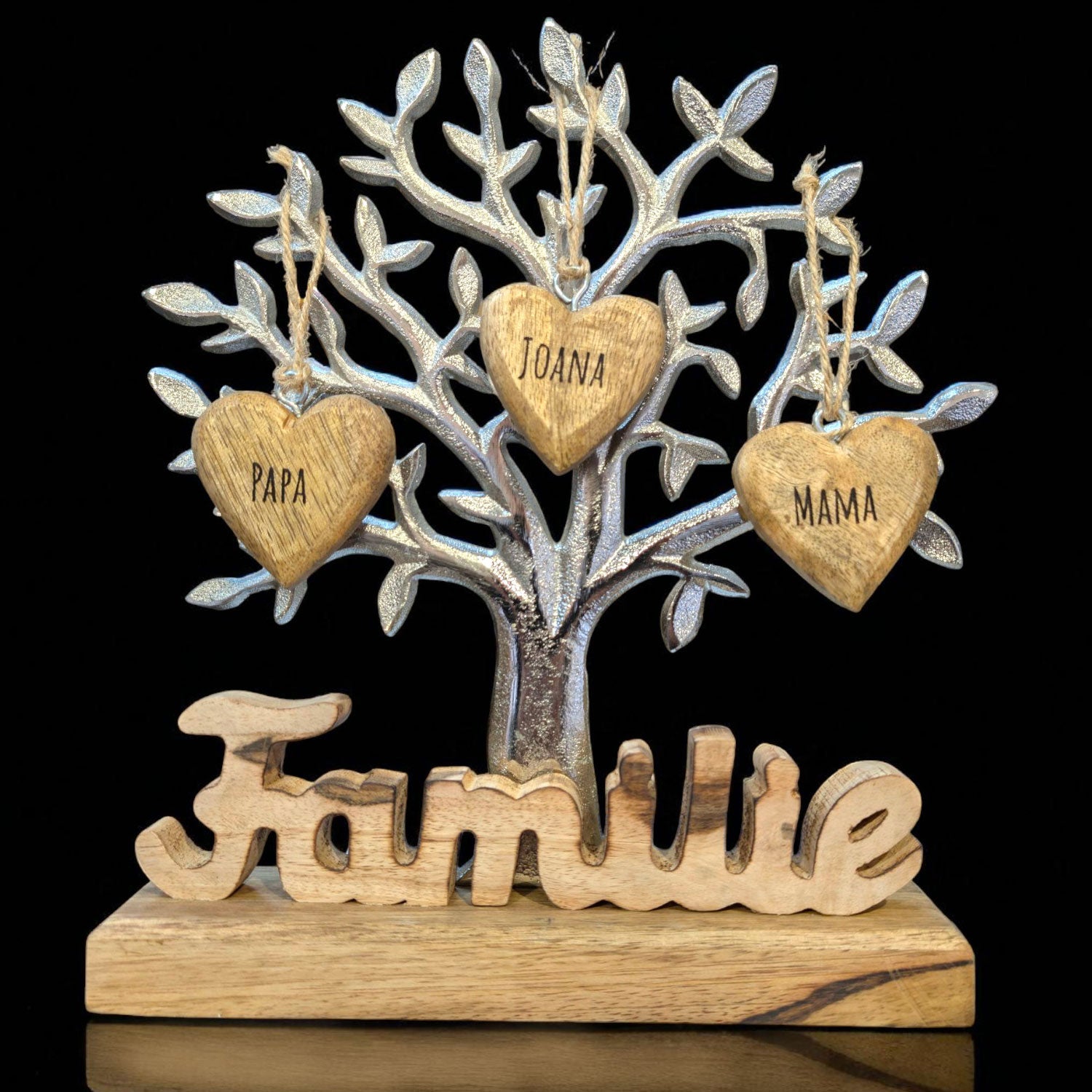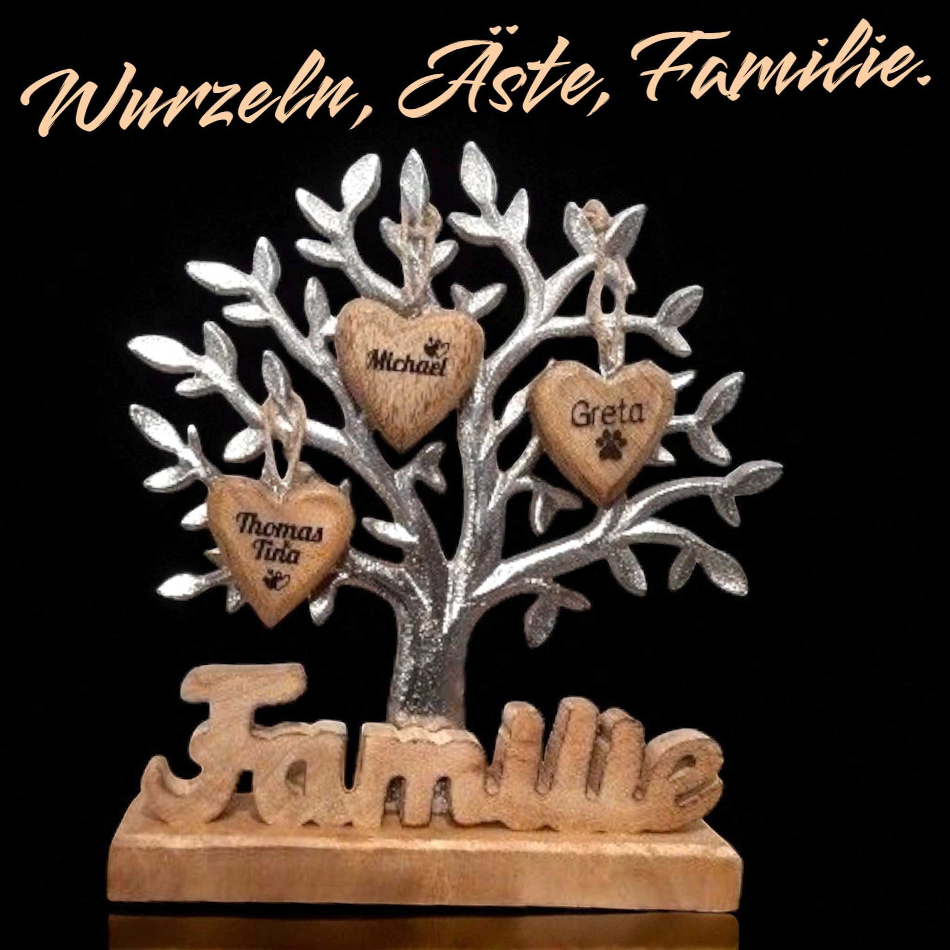 Ein Lebensbaum, verziert mit dem bedeutungsvollen Schriftzug "Familie" und drei einzigartigen Holzherzchen, die liebevoll graviert sind – dieses Geschenk ist mehr als nur eine Dekoration!