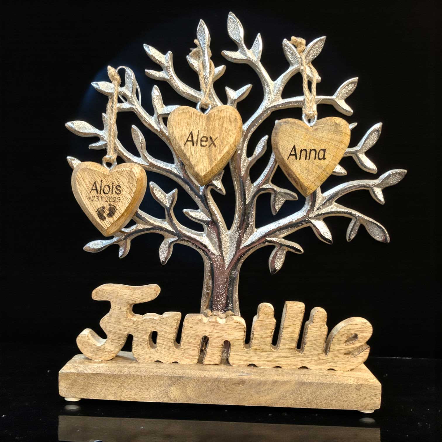 Baum mit Schriftzug "Familie" 23cm mit 3 gravierten Holzherzen