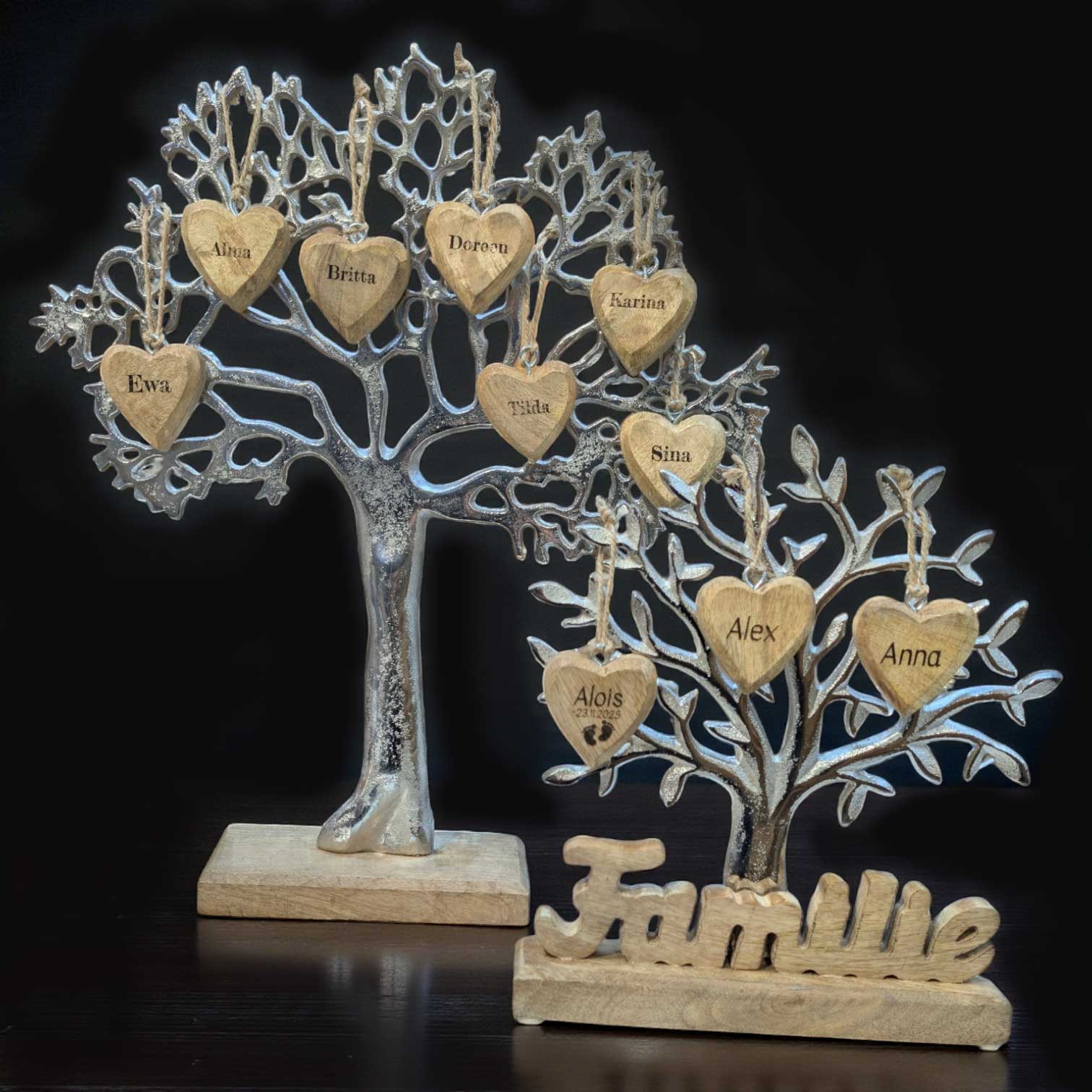 Die Gravur auf den Holzherzchen dürfen Sie frei wählen. Es können z. B. Vornamen oder Daten graviert werden, und somit erhalten Sie einen ganz besonderen Stammbaum und eine wunderbare Erinnerung.