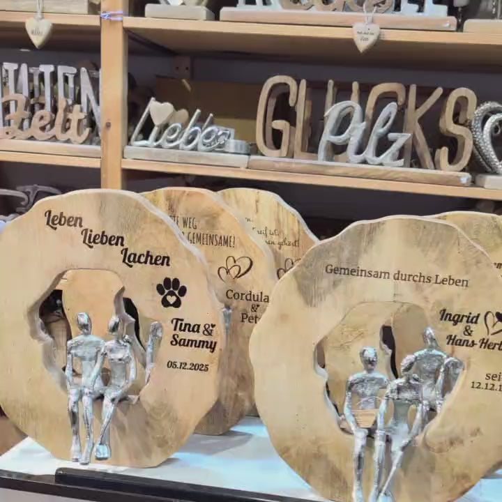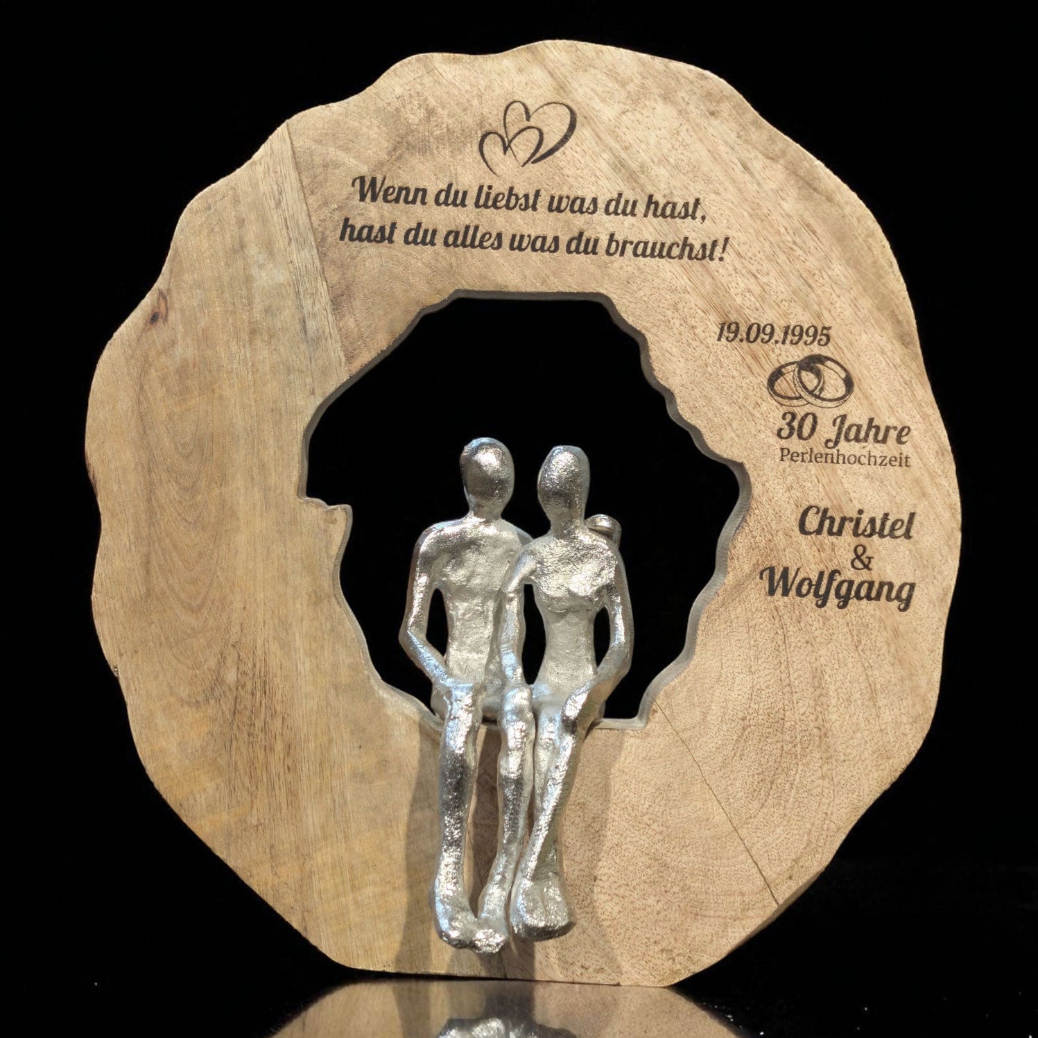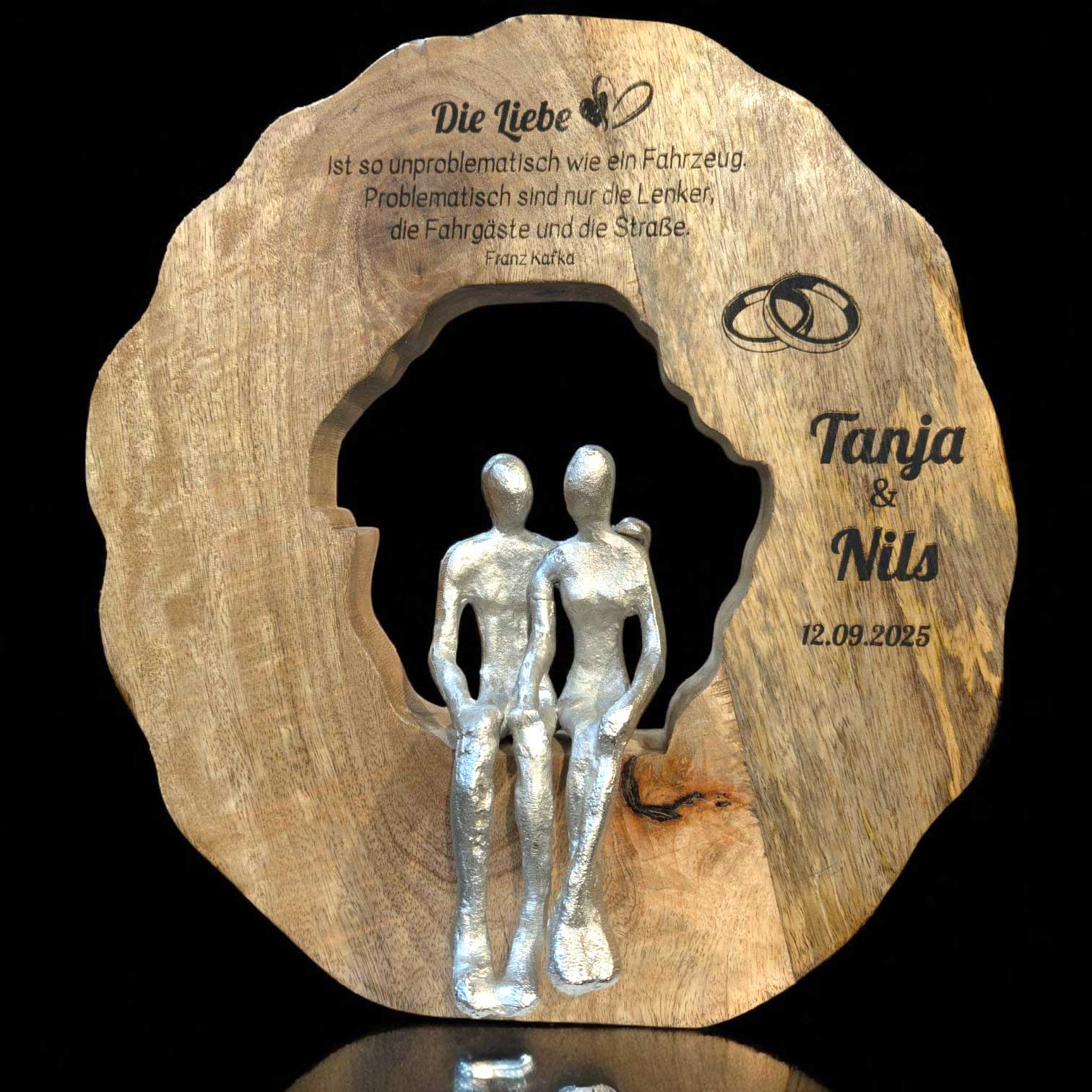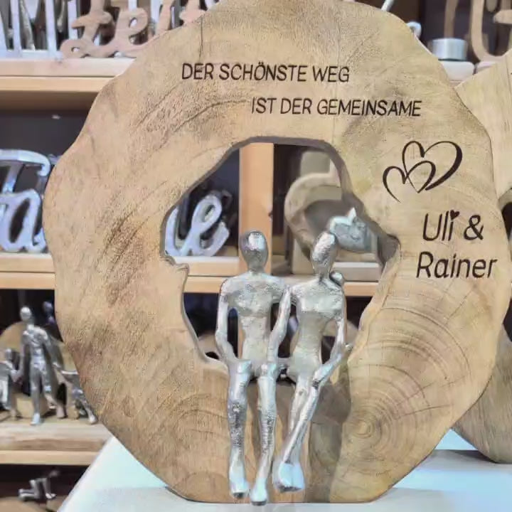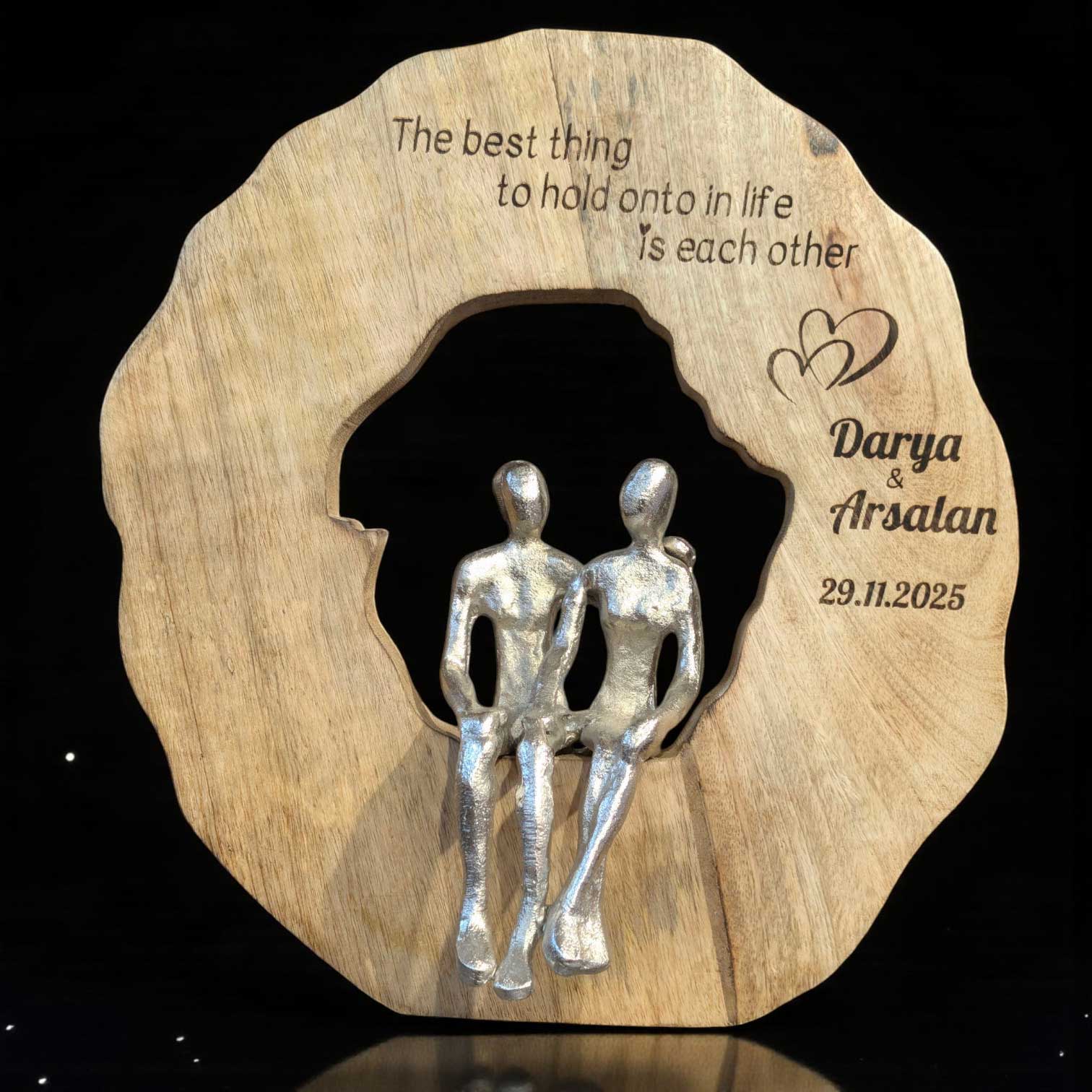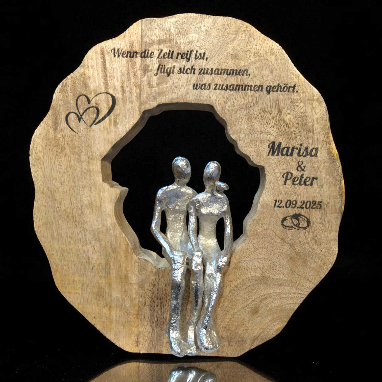 Mache den schönsten Tag im Leben eines Paares noch unvergesslicher mit unserem einzigartigen Hochzeitsgeschenk: eine elegante, runde Holzscheibe mit einem liebevoll gestalteten silbernen Paar in der Mitte.