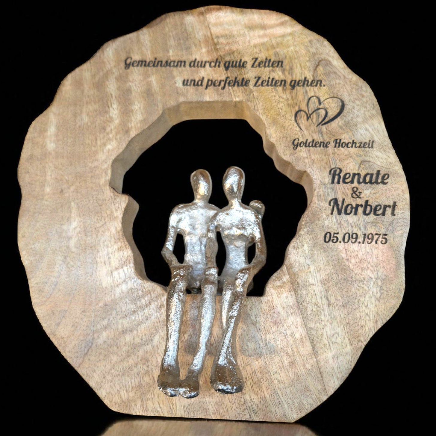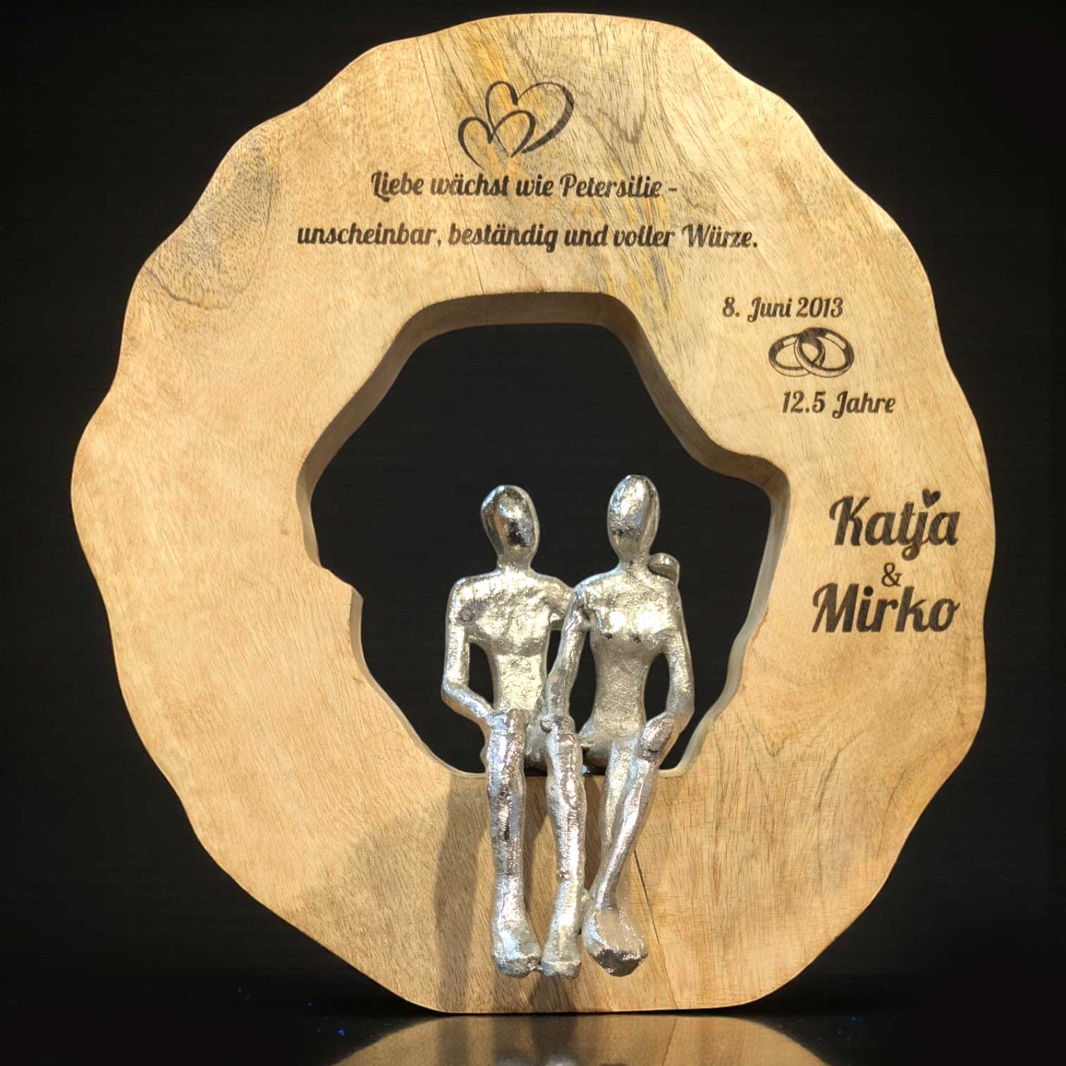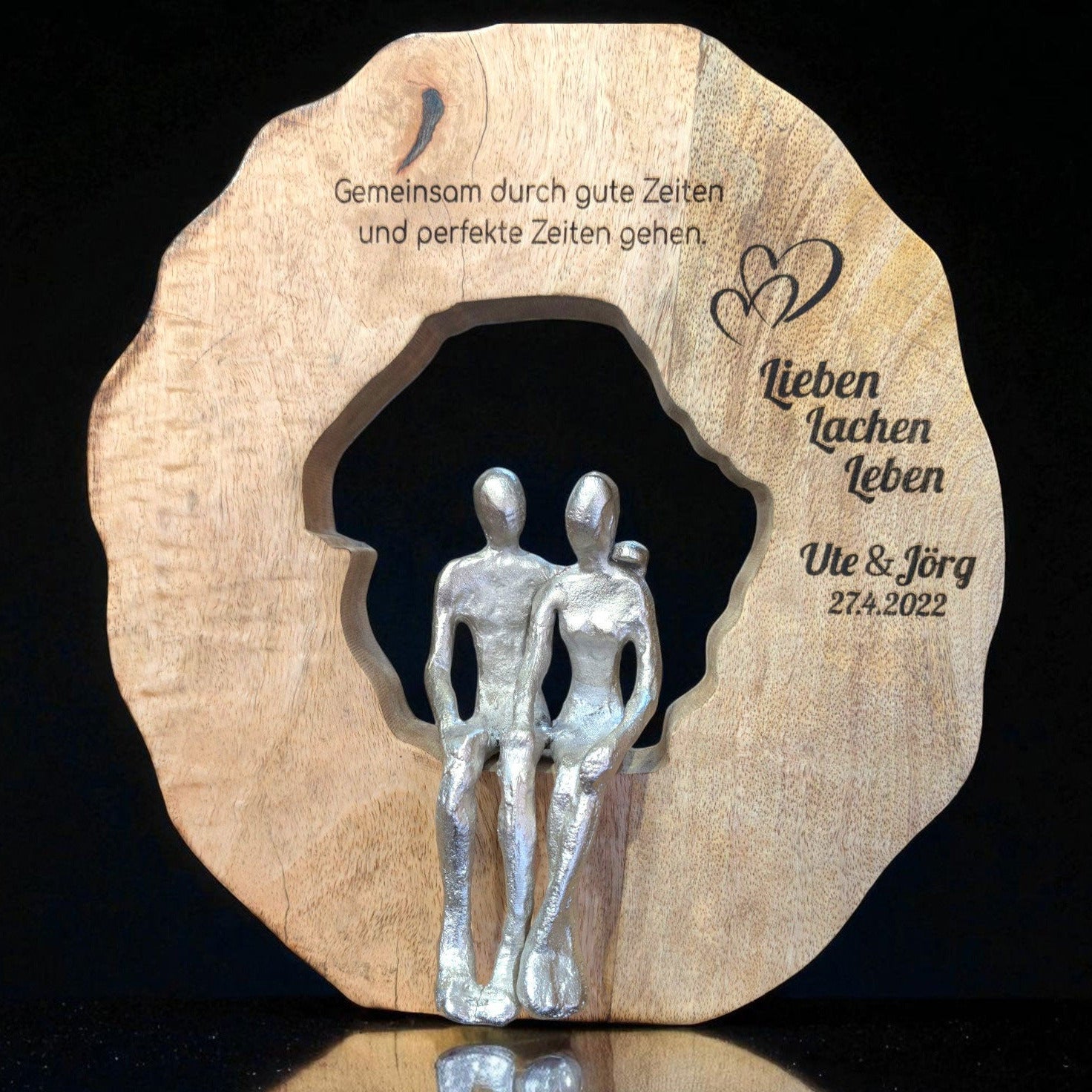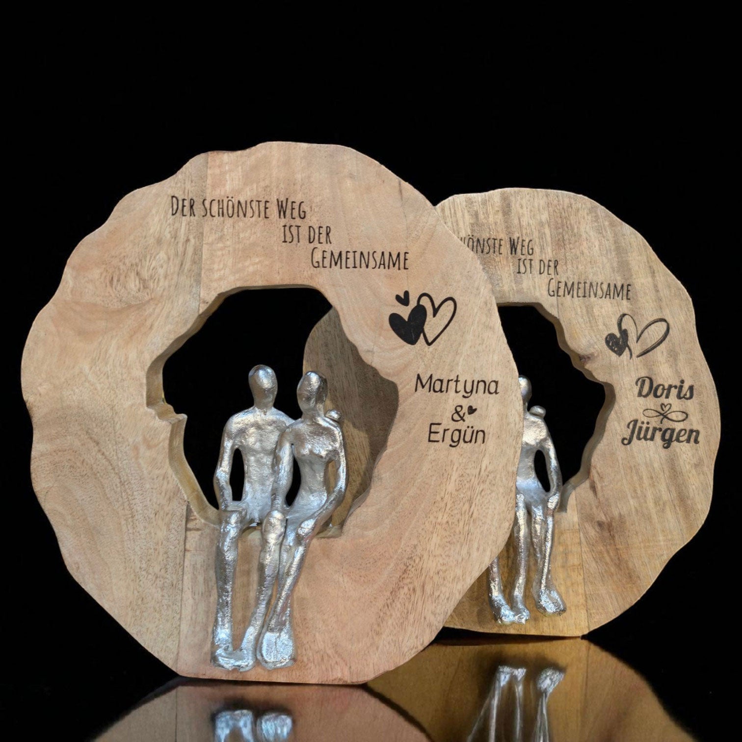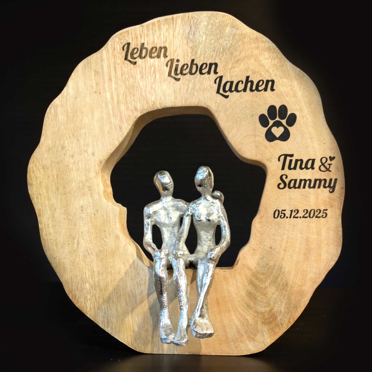 Mache den schönsten Tag im Leben eines Paares noch unvergesslicher mit unserem einzigartigen Hochzeitsgeschenk: eine elegante, runde Holzscheibe mit einem liebevoll gestalteten silbernen Paar in der Mitte.