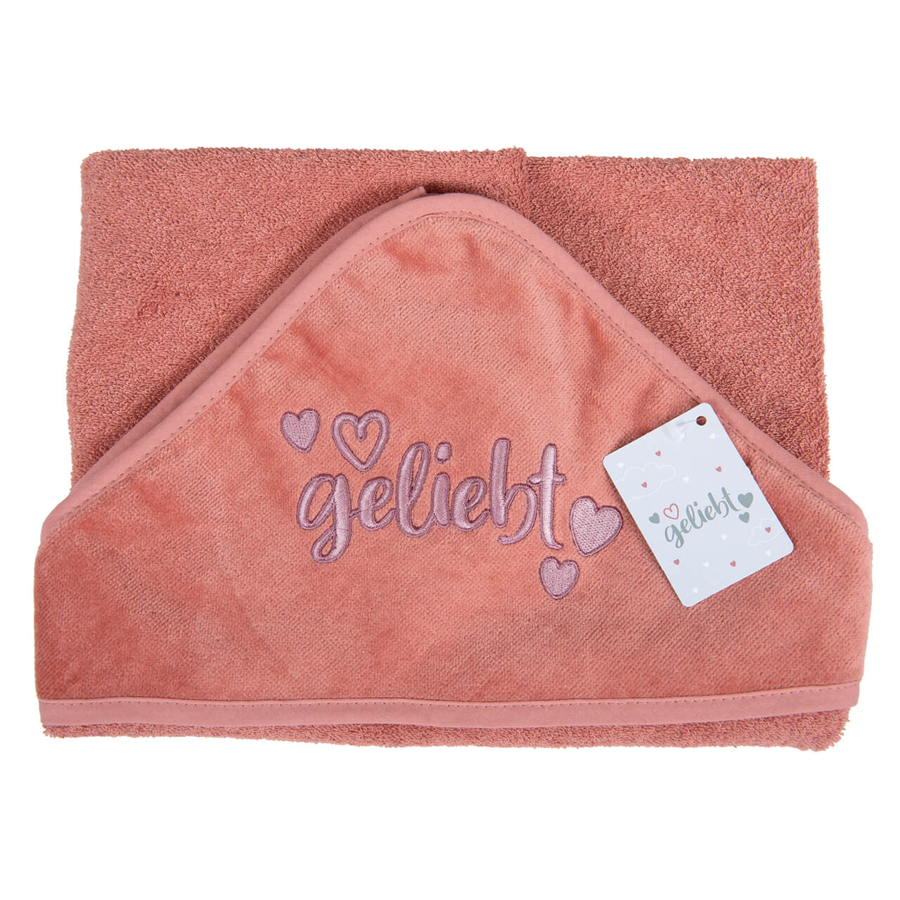 Das Baby-Badetuch in der Trendfarbe Altrosa mit niedlichem Stick „geliebt“ und kleinen Herzen hat eine praktische Kapuze, die nach dem Badespaß vor Zugluft schützt.