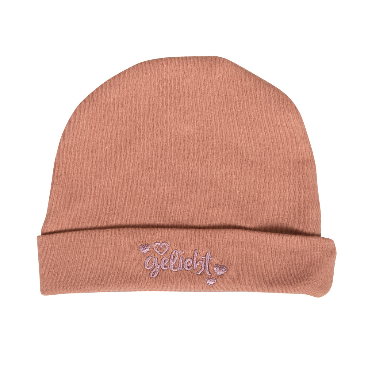 Hochwertige Baby-Mütze aus angenehmer Baumwolle mit liebevoller Stickerei „geliebt“ und kleinen Herzen auf dem Aufschlag.