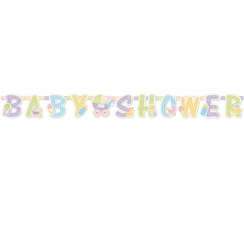 Die passende Raumdekoration für die Geburt eines Kindes oder eine fröhliche Babyparty. Diese bunte Textkette mit dem Schriftzug "Baby Shower" sorgt für eine liebevolle und festliche Atmosphäre.