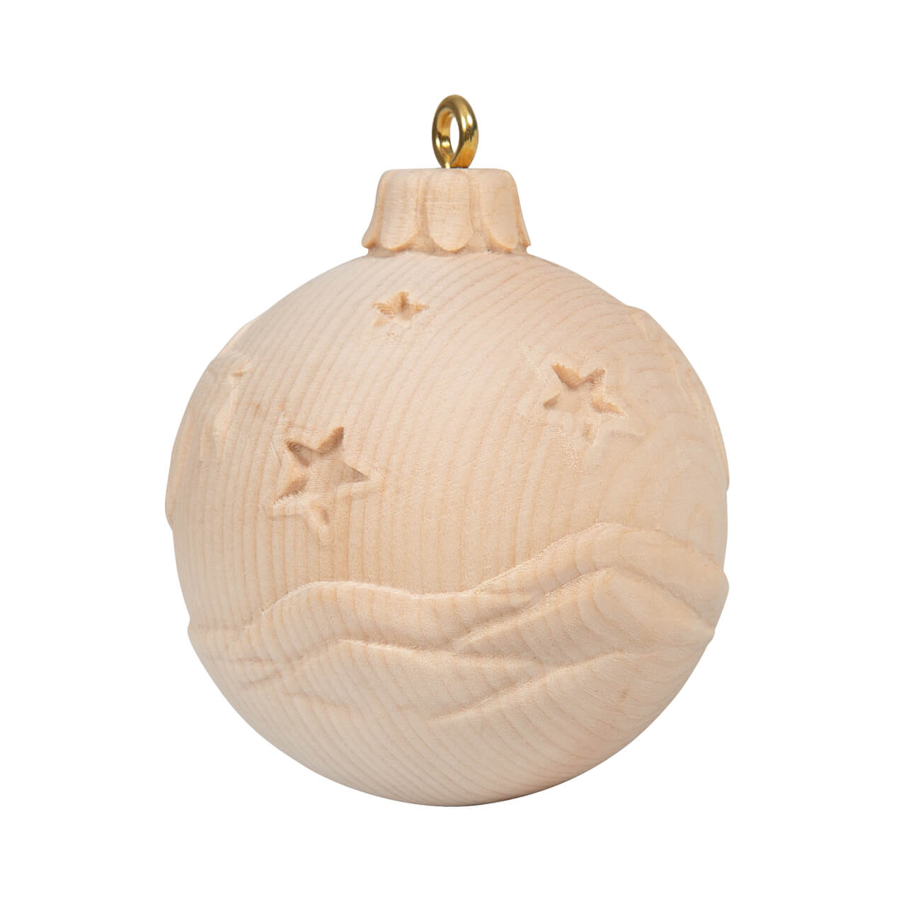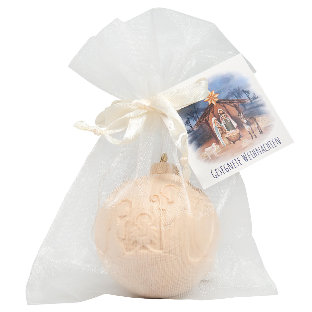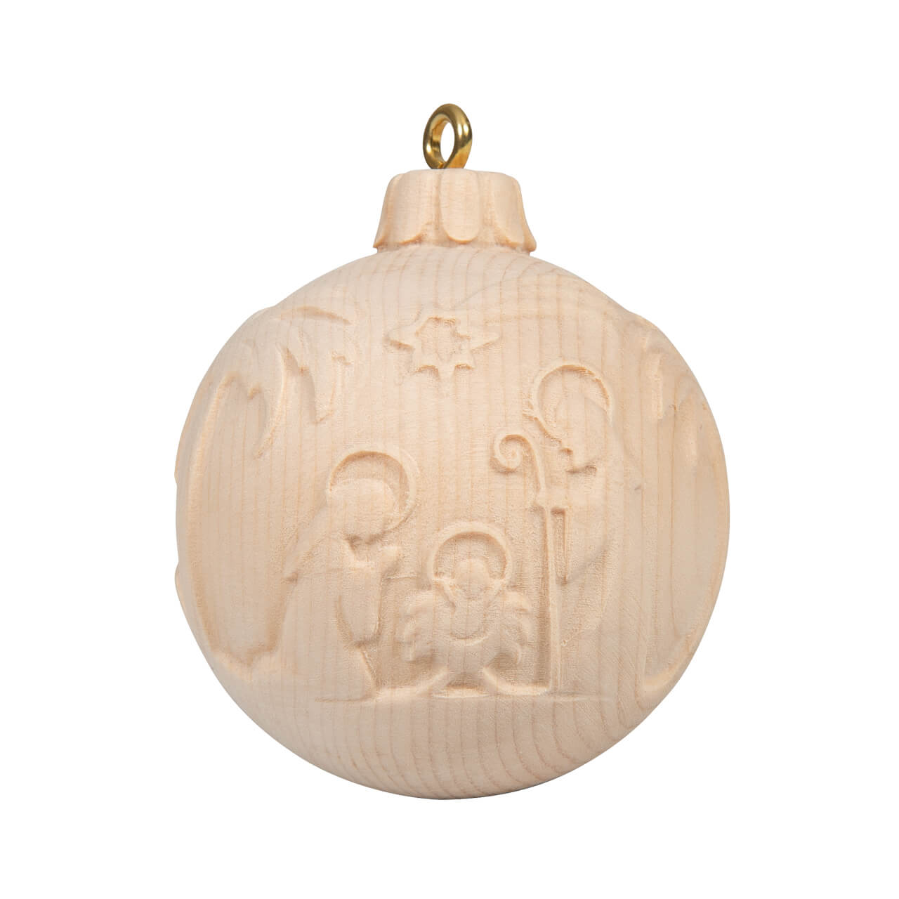 Ein ganz besonderer Baumschmuck ist diese Kugel aus massivem Zirbenholz, rundum mit Krippenmotiv mit der Heiligen Familie gefräst. Auch eine wunderschöne Geschenkidee in der Weihnachtszeit.
