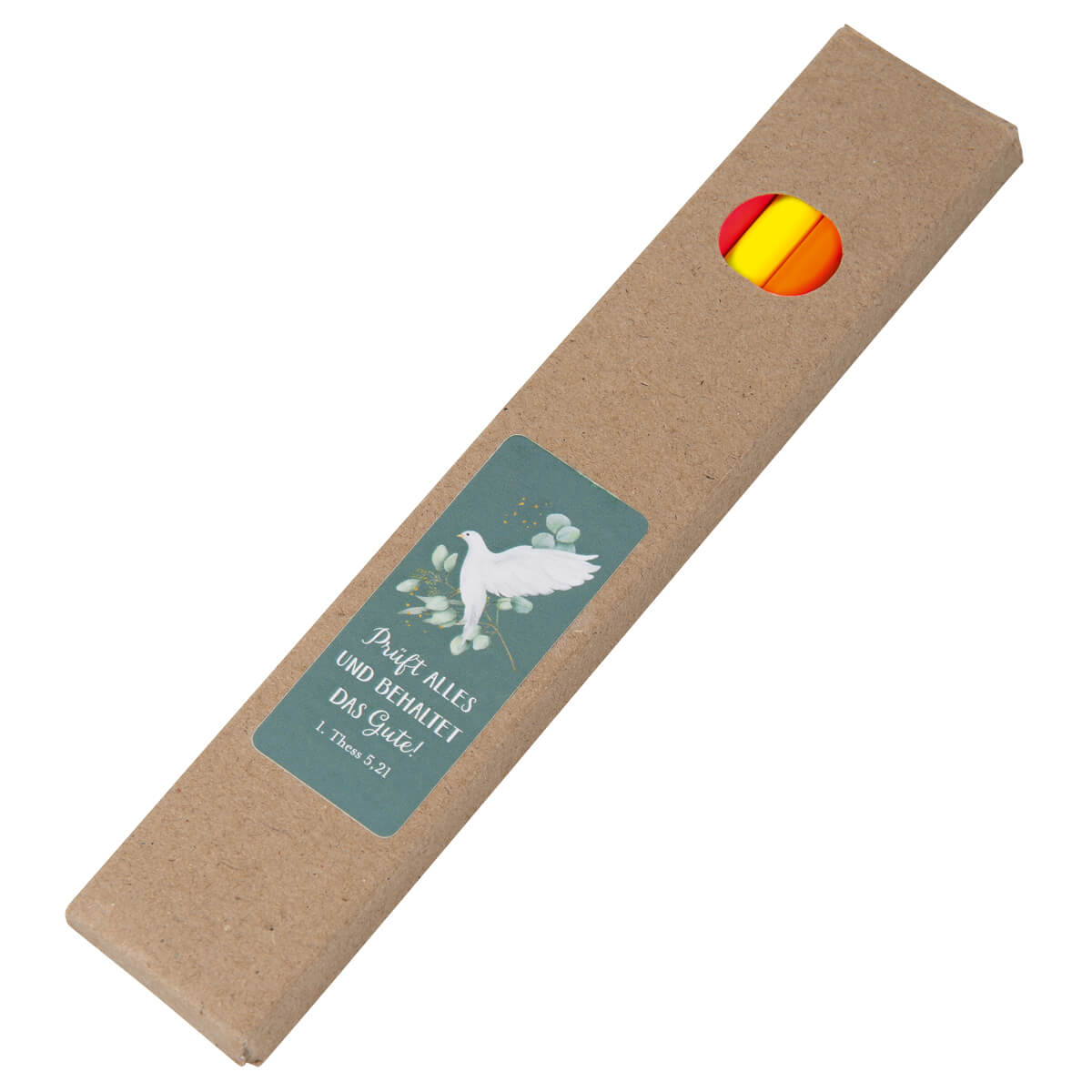 Ideal zum Markieren wichtiger Stellen in der Bibel: Bibel-Markierstifte Set mit vier Buntstiften in leuchtenden Farben, verpackt in Schachtel mit Etikett des Jahreslosungsmotivs 2025.