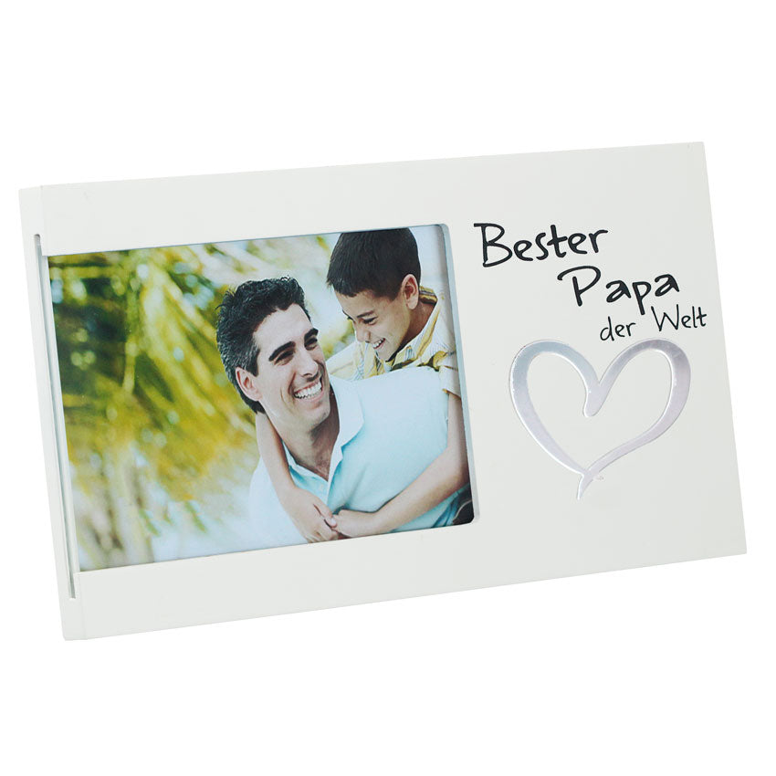 Der edle Bilderrahmen in weiß mit silbernem Herz kann mit einem schönem Foto von Familie und Kindern bestückt werden und wird so jeden Vater daran erinnern, dass er einfach der Beste ist.