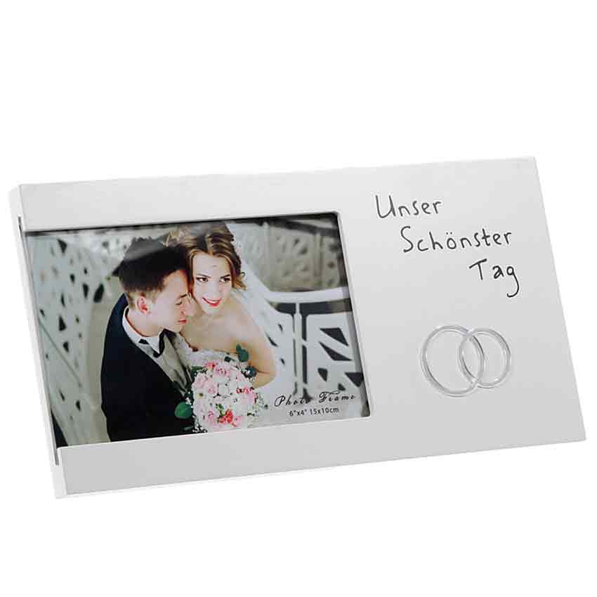 Der Bilderrahmen für Hochzeitsfoto ist in schlichtem Weiß gehaltern und mit dem passenden Spruch "Unser schönster Tag" beschrieben, darunter ist eine silber glänzende Applikation in Form von verbundenen Eheringen zu finden.