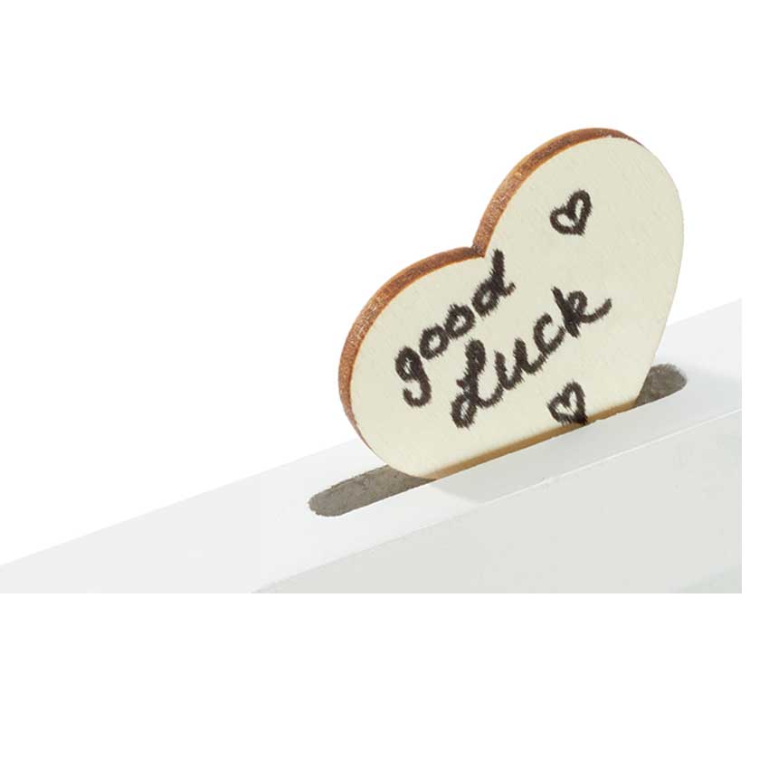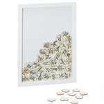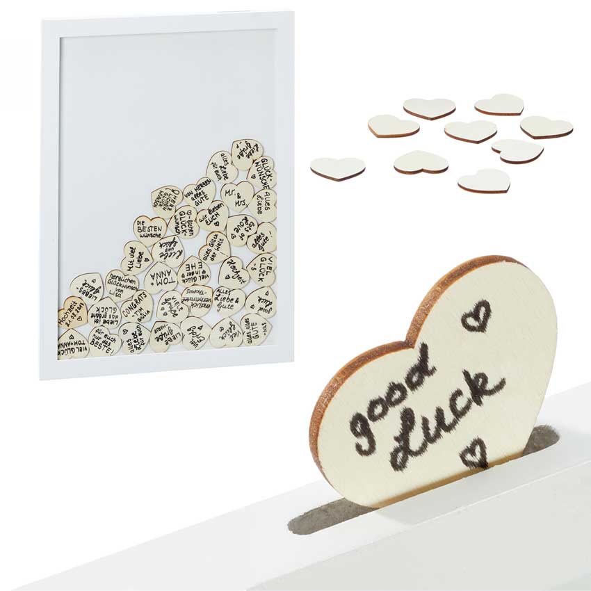 Stellen Sie den weißen Rahmen mit Glasfront auf und bitten Sie Ihre Gäste, ihre Wünsche auf die Holzherzen zu schreiben und diese in die dafür vorgesehene Öffnung im Rahmen zu stecken. So können Sie sich immer wieder an Ihren schönsten Tag im Leben und Ihre Gäste erinnern.