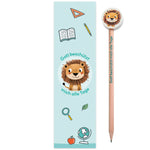 Dazu ein Aufsteck-Radiergummi und ein passendes Lesezeichen mit unserem lustigen Löwen.