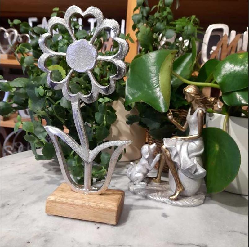 Verschenke Blumen mal ganz anders, nämlich mit diesem Deko Aufsteller aus matt glänzendem Metall auf einem natürlichen Holzfuß.
