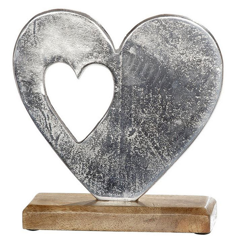 Ein großes stehendes Herz aus Metall auf einem glatten Holzsockel. Das hochwertige Aluminium des Herzens ist mit einer feinen Struktur versehen, was dem Dekoherz zusätzliche Tiefe verleiht.