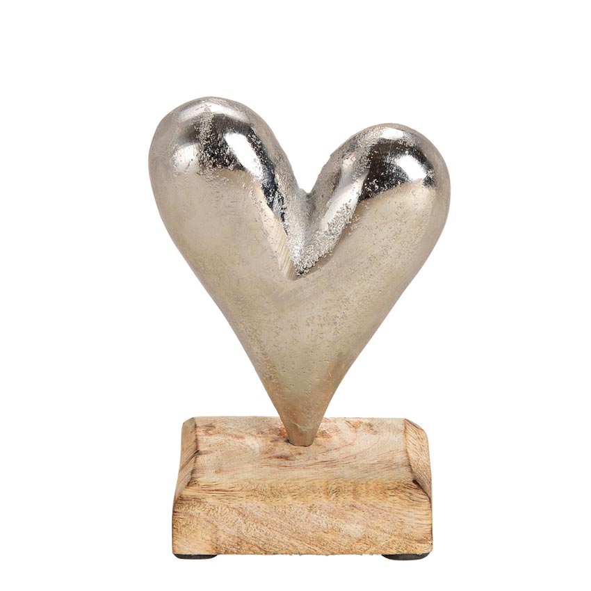Das strukturierte Metall Herz mit seiner 3D Form sitzt auf einem glatten, geradlinigen Holzfuß.
