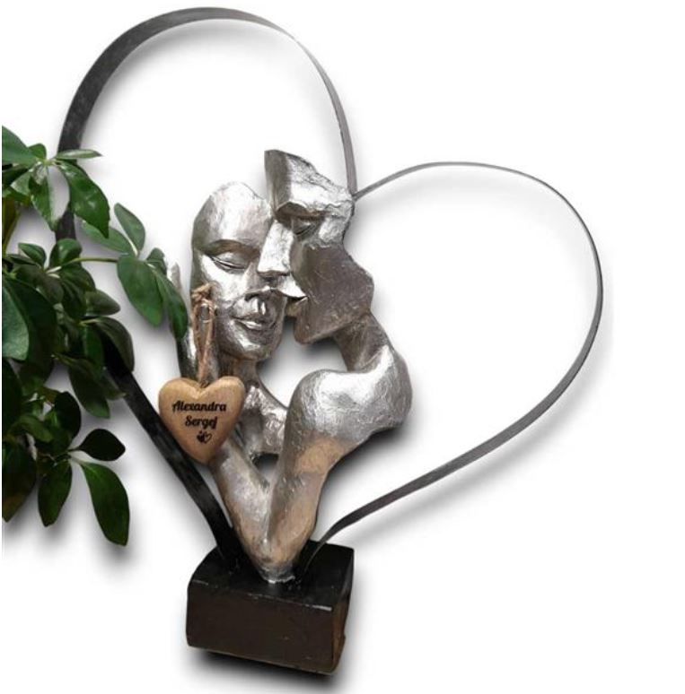 Eine moderne Skulptur, welche in den Mitte eines Herzens die schemenhafte Andeutung eines vertrauten Liebespaares zeigt.