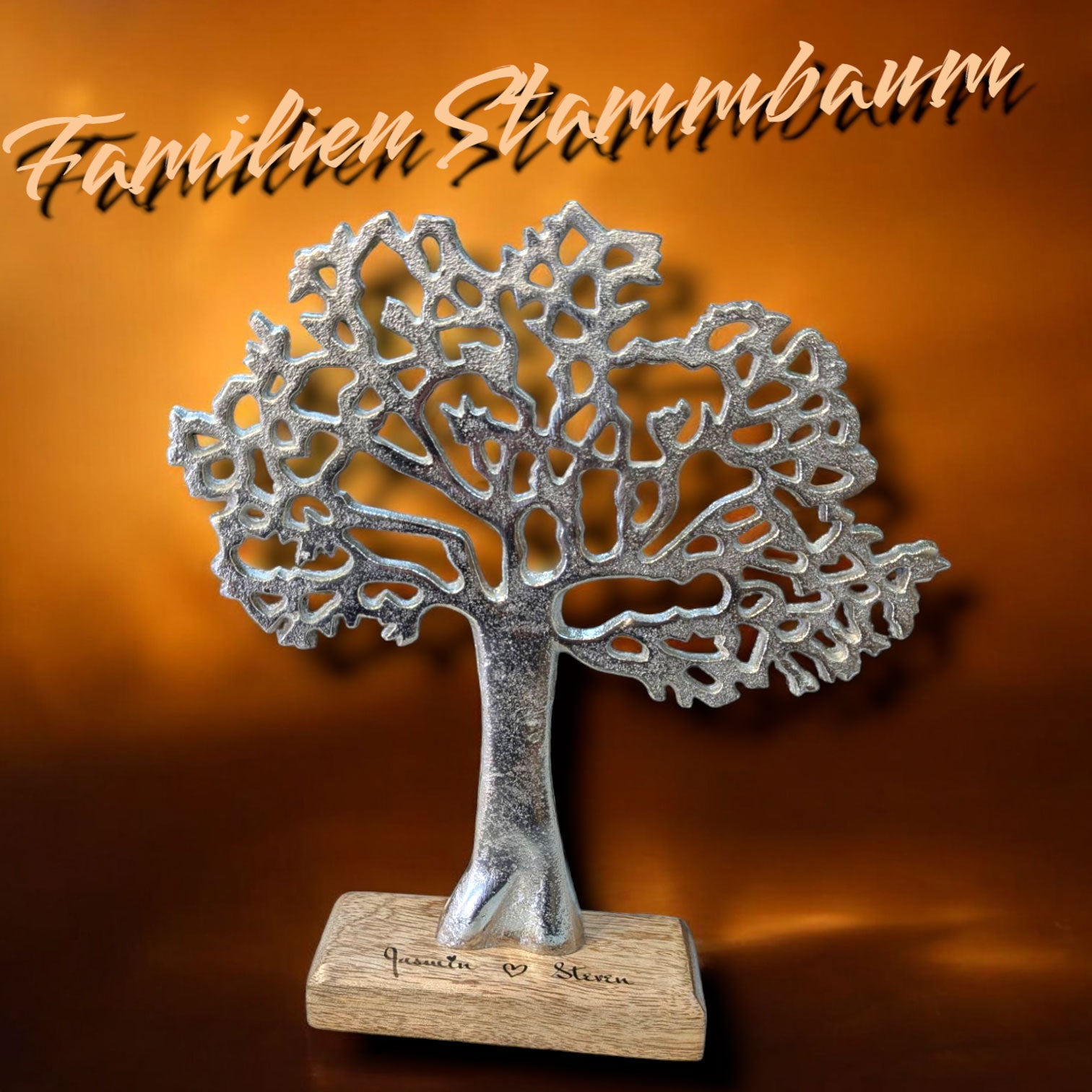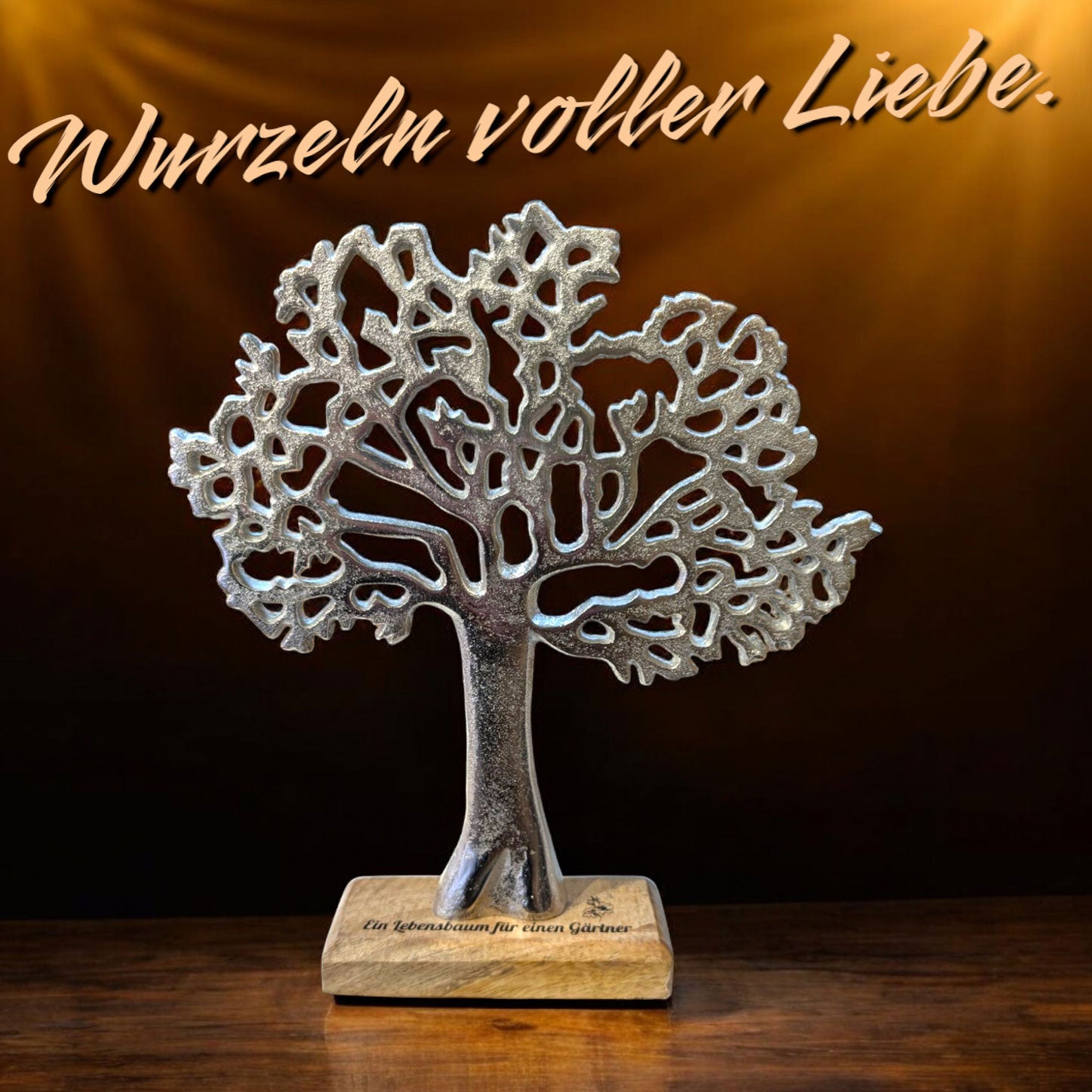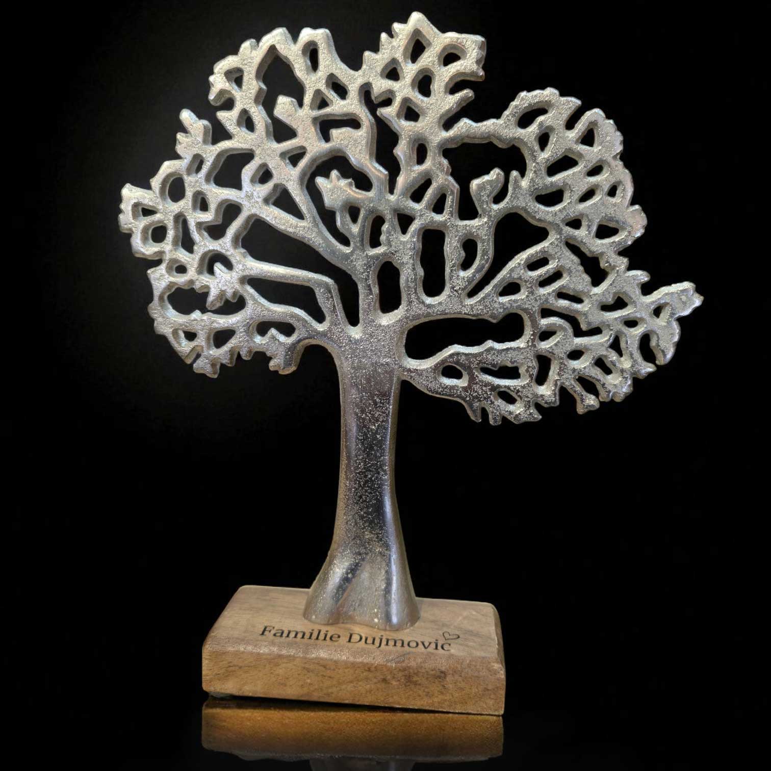 Eine wunderschöne Dekoration in Form eines silbernen Baumes mit einem gemaserten Holzsockel. Der Aufsteller begeistert durch die Verwendung verschiedener Materialien und der fein ausgearbeiteten Details.