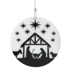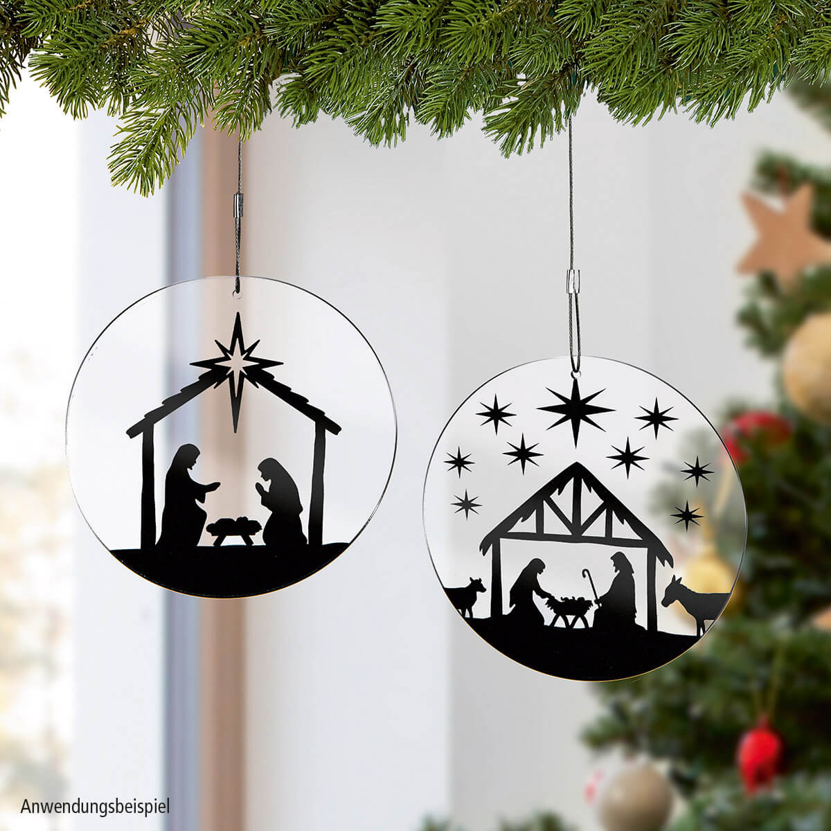 Ein stilvoller Anhänger für die Weihnachtszeit. Der runde Dekohänger zeigt eine feine Krippenszene mit Maria, Josef und dem Jesuskind, umgeben von funkelnden Sternen. Gefertigt aus transparentem Acryl wirkt das Motiv leicht und modern, perfekt für Fenster, Zweige oder weihnachtliche Gestecke.
