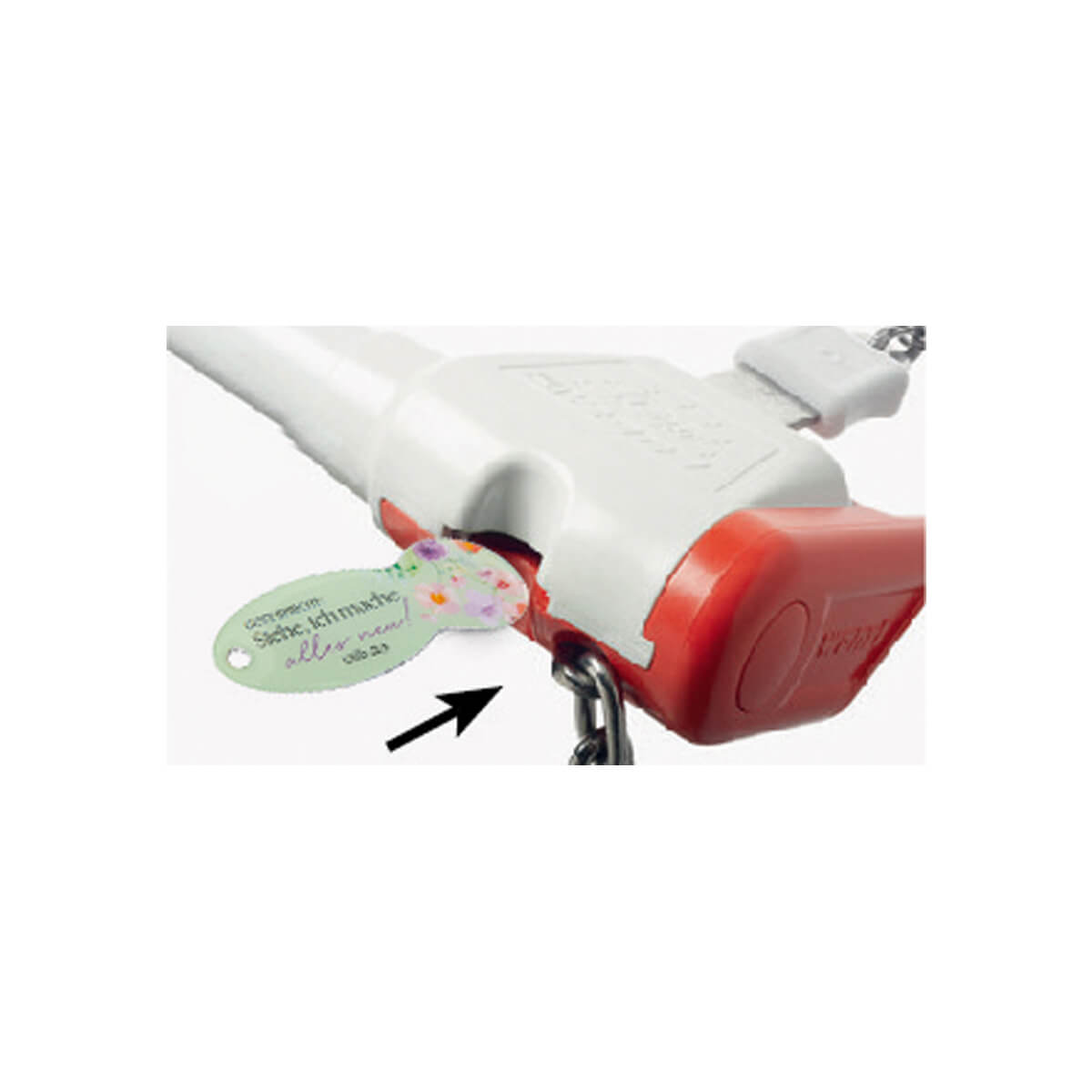 Einkaufen ohne Chip oder Münze: Der Einkaufswagenhelfer mit schönem Motiv Jahreslosung 2026 „Gott spricht: Siehe, ich mache alles neu!“ bewahrt man am besten am Schlüsselbund auf.