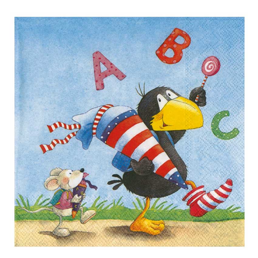Mit Rabe, Maus und prall gefüllten Schultüten sind diese farbenfrohen Servietten perfekt für den Start ins Schulleben.