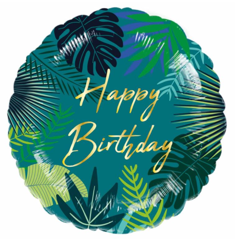 Runder Folienballon zum Geburtstag mit tropischen Motiv: Viele verschiedene Palmblätter winden sich um den goldenen Schriftzug "Happy Birthday" und vermitteln so ein wenig Urlaubsfeeling und gute Laune.