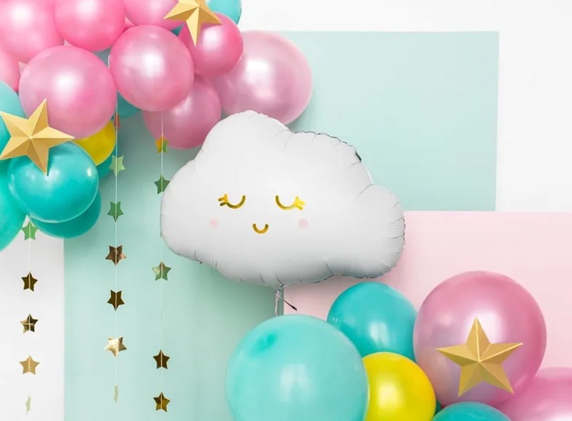 Der Folienballon Wolke kommt in einem matten Weiß mit einem Gesicht in glänzendem Gold und zartrosanem Wangenrot.
