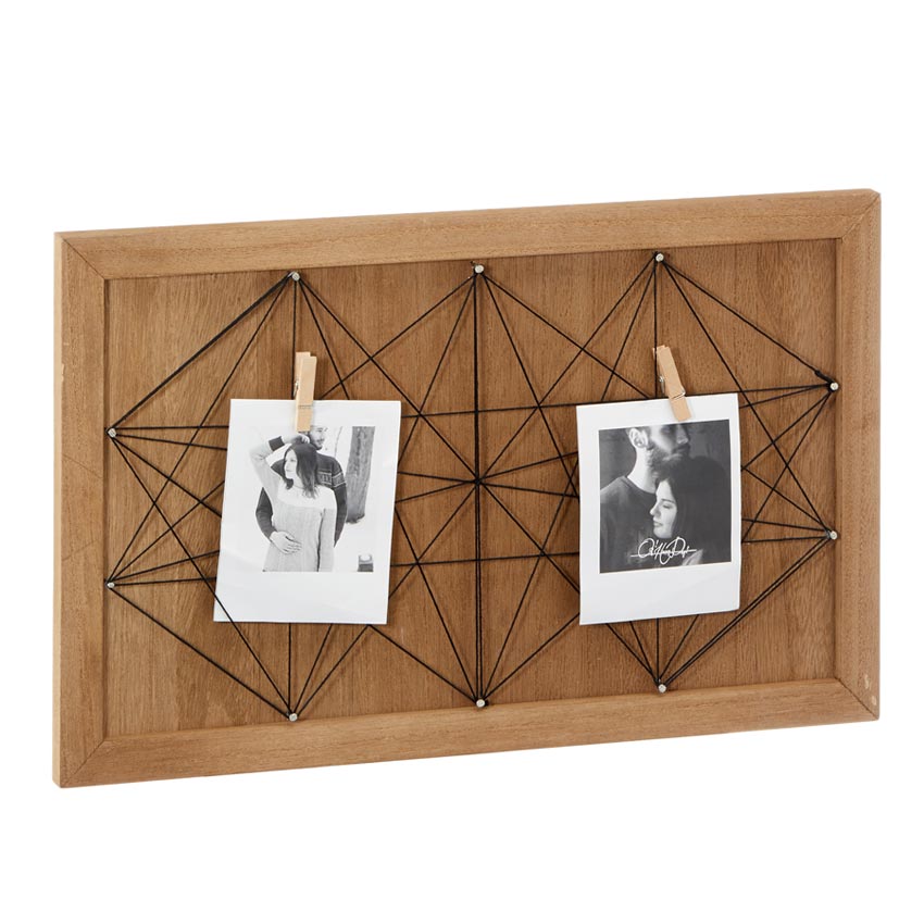 Ein ausgefallener Bilderahmen im Holz Dekor mit schwarzerm Faden, welcher zu modernen, geometrischen Formen gespannt ist.