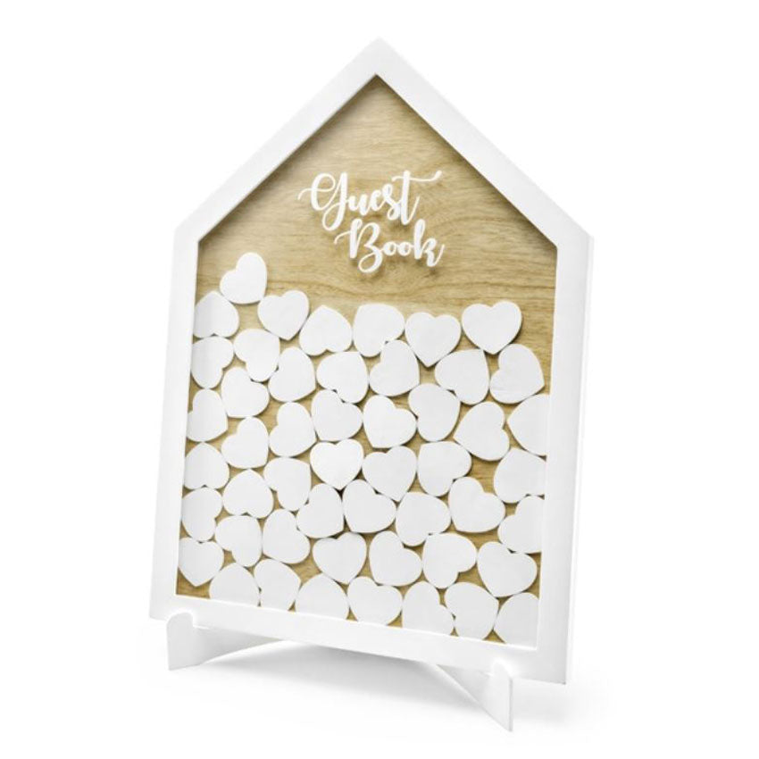 Ein kreatives Gästebuch, das ein wunderschönes Erinnerungsstück kreiert. Ihre Gäste können sich einfach auf den kleinen weißen Herzchen verewigen und diese in den Holzrahmen in Form eines Hauses einsetzen.