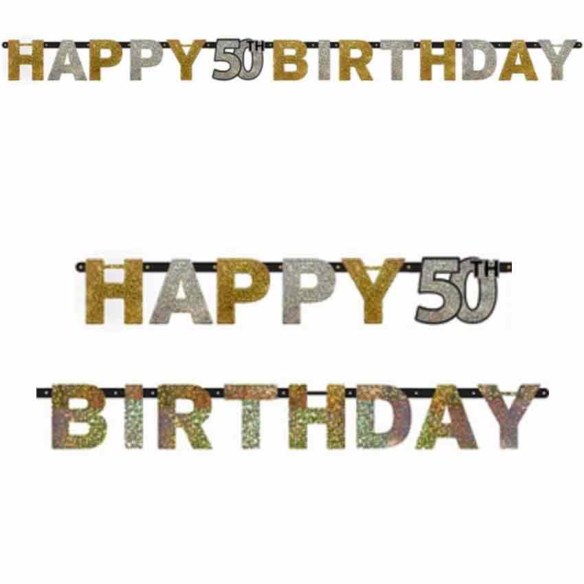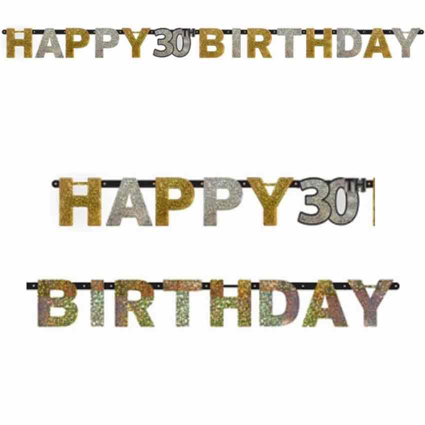Diese XL Textkette aus der Serie Glamour Gold ist eine edle Dekoration für besondere Geburtstagsfeste. Die großen Buchstaben im Wechsel aus goldenen und silbernen Glitzer Effekten ziehen alle Blicke auf sich und sorgen für eine festliche, elegante Stimmung im Raum. Durch ihre Länge kann die Girlande gut über Türen, an der Wand oder quer durch den Partyraum aufgehängt werden.