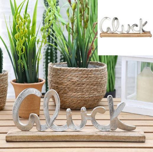 Eine Materialkomposition zusammengestellt aus gemastertem Mangoholz und edel glänzendem Aluminium. So gegensätzlich und doch wohl harmonierend entsteht ein wundervoller Deko Aufsteller dessen Design nur noch durch die tolle Botschaft übertroffen wird: Glück!