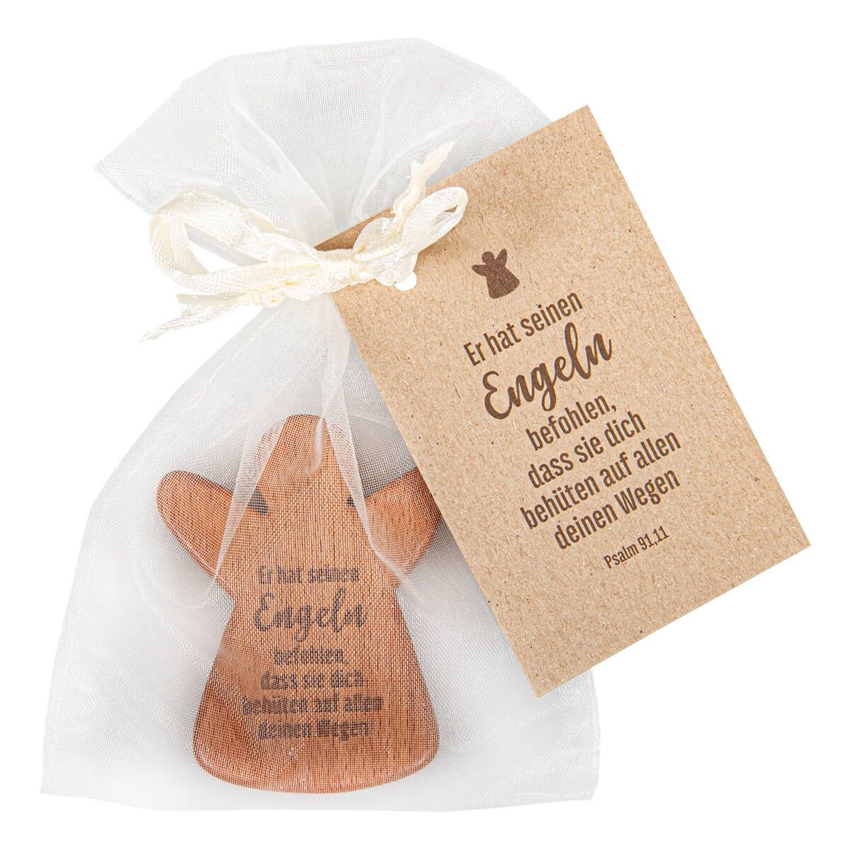 Der kleine Holzengel liegt angenehm warm in der Hand und eignet sich ideal als täglicher Begleiter, Glücksbringer oder als Symbol der Verbundenheit. Die fein eingravierte Bibelstelle aus Psalm 91,11 vermittelt Schutz und Zuversicht im Alltag.