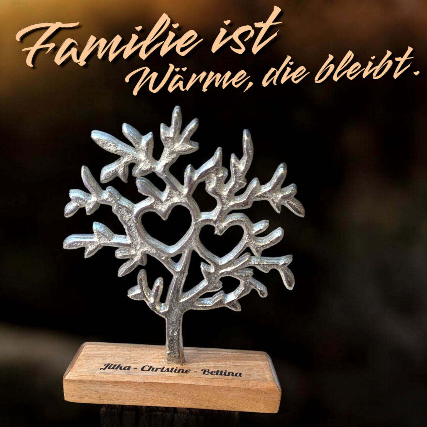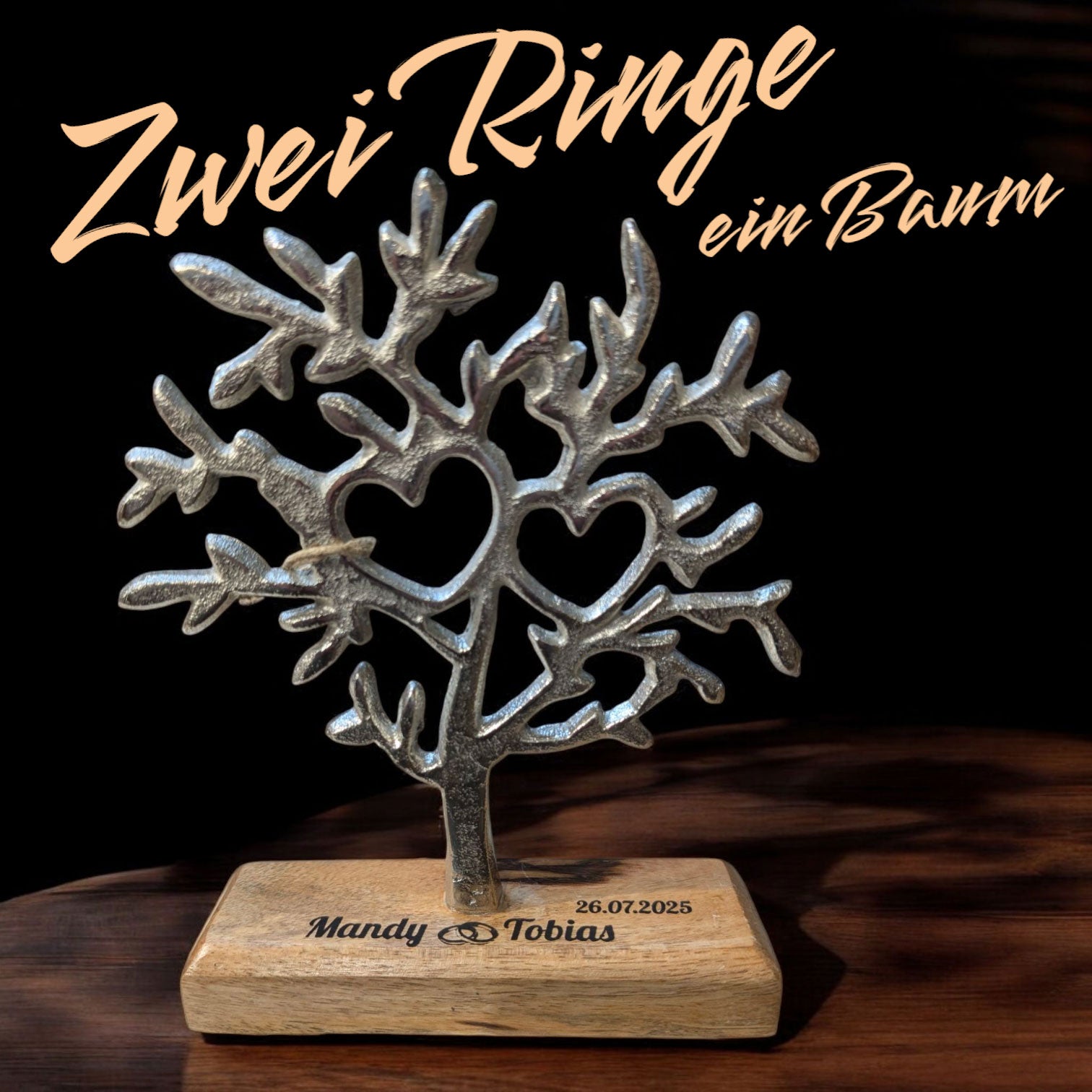 Um ein individuelles Hochzeitsgeschenk aus diesem schönen Deko-Artikel zu machen, gravieren wir die Vornamen des Brautpaares sowie das Hochzeitsdatum auf den Holzsockel des Baumes. So wird der Baum zu einer ganz persönlichen Aufmerksamkeit, welche auch nach vielen Jahren noch an einen wunderbaren Tag zurückdenken lässt.