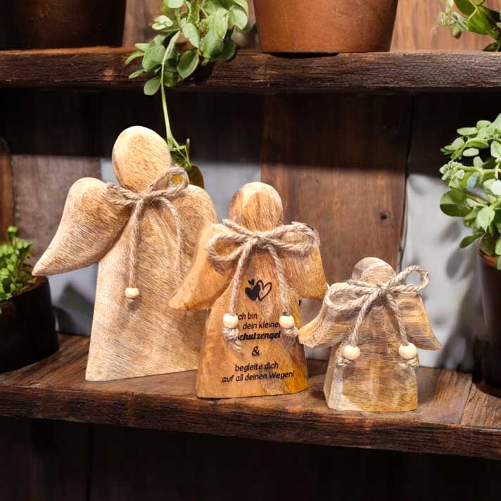 So schlicht und doch so schön kann Dekoration sein sein. Reines Mangoholz zu einem kleinen Engel geschnitzt und mit einer Juteschleife verziert für eine dezente Wohndekoration mit dem gewissen Wohlfühlfaktor. Durch das natürliche Holz ist die Engelsfigur charmant, warm und einfach ein liebliches Detail, nicht nur in der Weihnachtsdekoration.