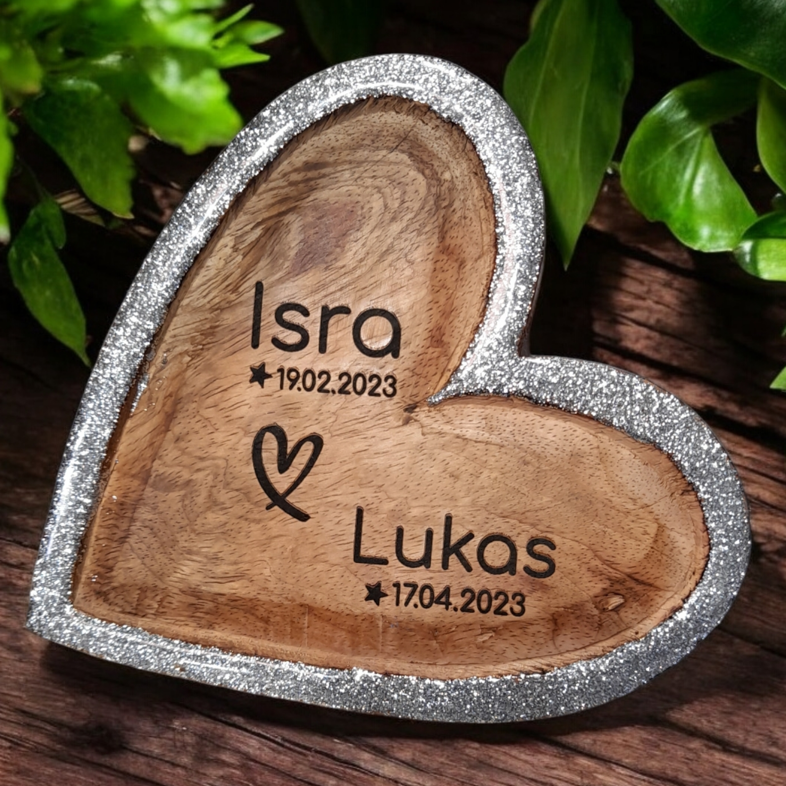 Das urige Mangoholz mit seiner prägnanten Maserung wird herrlich mit einem silbernen Rand umrahmt, sodass das Holzherz massiv an Raffinesse gewinnt.