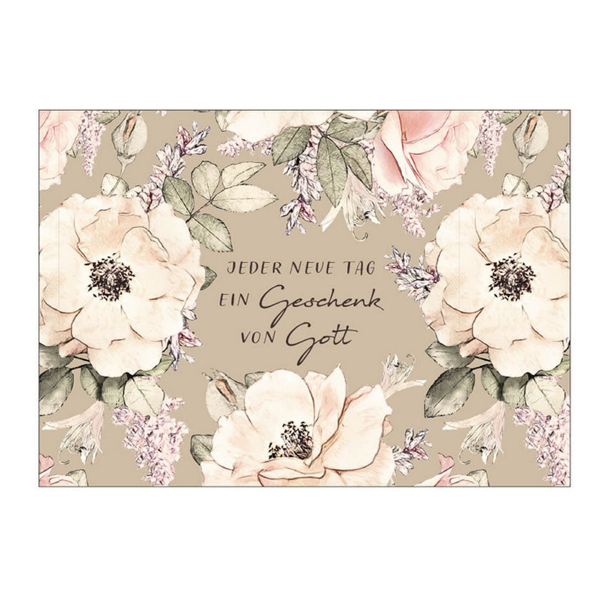 Postkarte mit Blumenmuster "Jeder neue Tag ein Geschenk von Gott" in creme und taupe