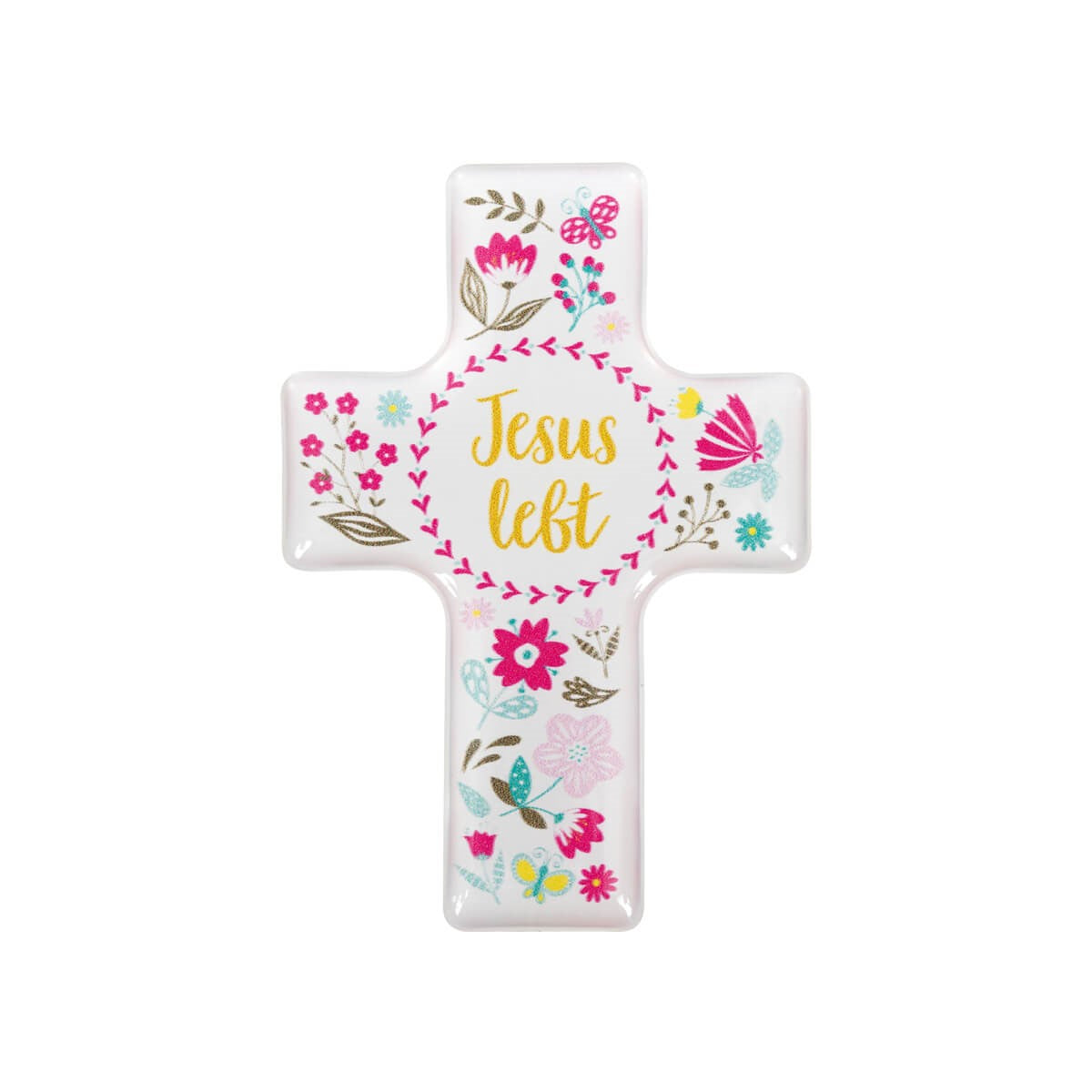 Ein fröhlicher Magnet in Form eines Kreuzes. Er begeistert durch das farbenfrohe Blumenmuster und die große Aufschrift "Jesus lebt".