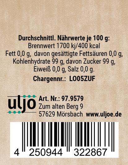 Nährwert je 100 g Brennwert 1700 kj / 400 kcal Fett 0,0 g - gesättigte Fettsäuren 0,0 g Kohlenhydrate 99,0 g - davon Zucker 99,0 g Eiweiß 0,0 g Salz 0,0 g