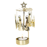 Ein Klassiker zur Weihnachtszeit und schön zu beobachten: Karussell-Teelichthalter aus Metall, goldfarben. Mit verschiedenen Krippen-Elementen, die sich durch die aufsteigende Wärme der brennenden Kerze drehen.
