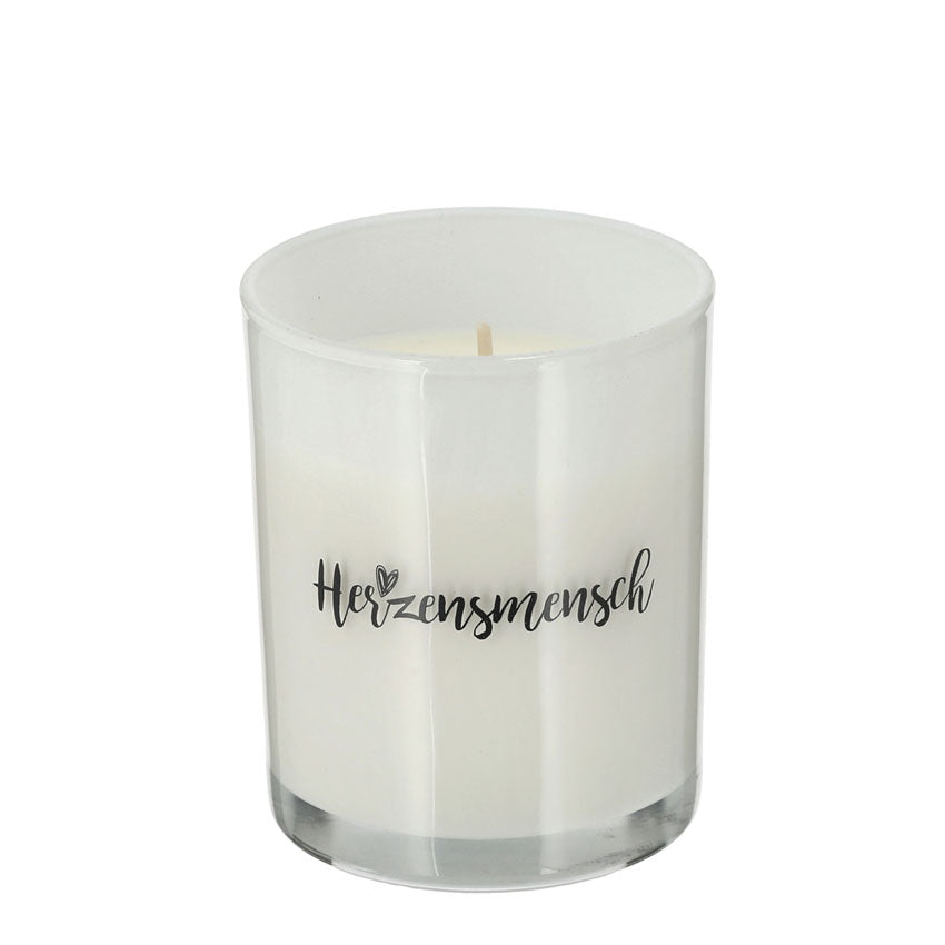 So wie dieses dezente Kerzenglas mit Kerze. In einem halbtransparenten Weiß zeigt das Windlicht die Aufschrift Herzensmensch.