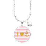 Der Hintergrund der Glaslinse ist weiß-rosa gestreift, außerdem wird die Kette Kreuz Herz Anker durch einen kleinen silbernen Herzanhänger abgerundet.