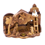 Wunderschöne, von Hand gefertigte Krippe aus Olivenholz mit Spieluhr. Jede ist ein Unikat und wird von den Kunsthandwerkern aus Bethlehem hergestellt.