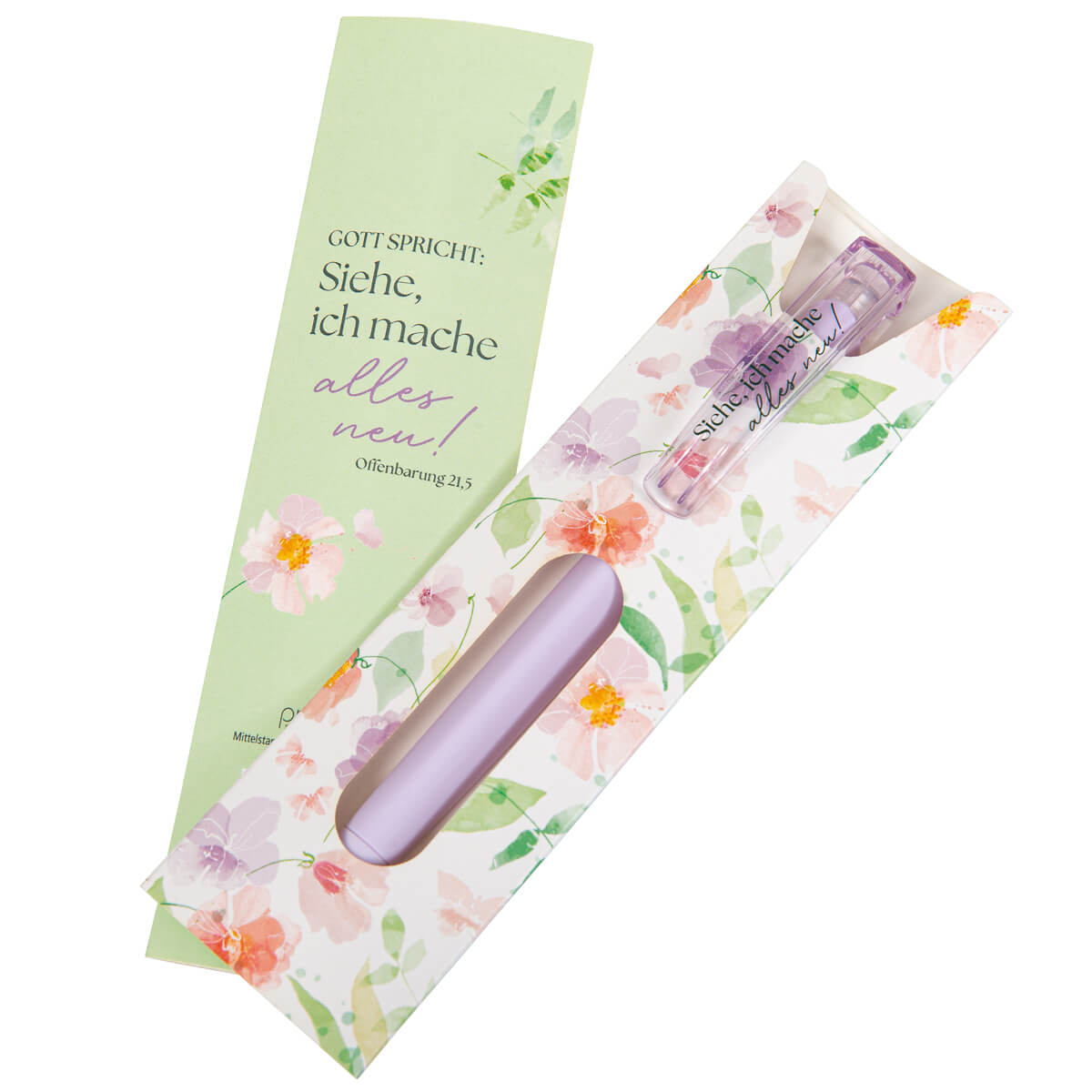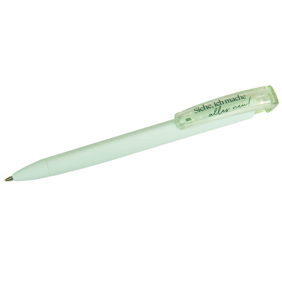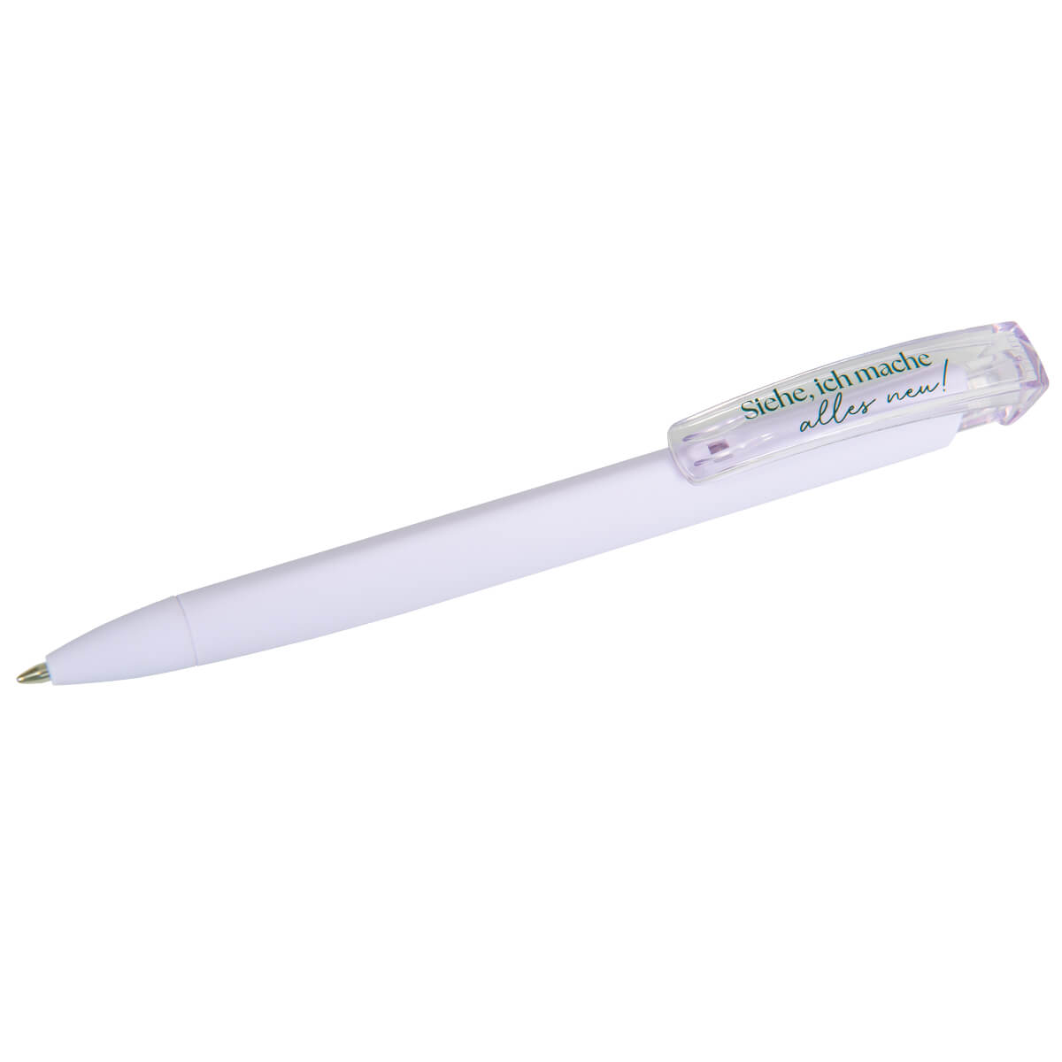 Die Jahreslosung 2026 auf einem hochwertigen Kugelschreiber mit Softtouch-Oberfläche in pastelligem flieder. Ergonomische Dreiecksform, bedruckt mit "Siehe, ich mache alles neu!" auf dem transparentfarbenem Clip.