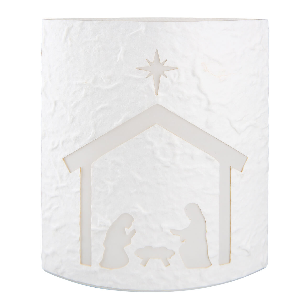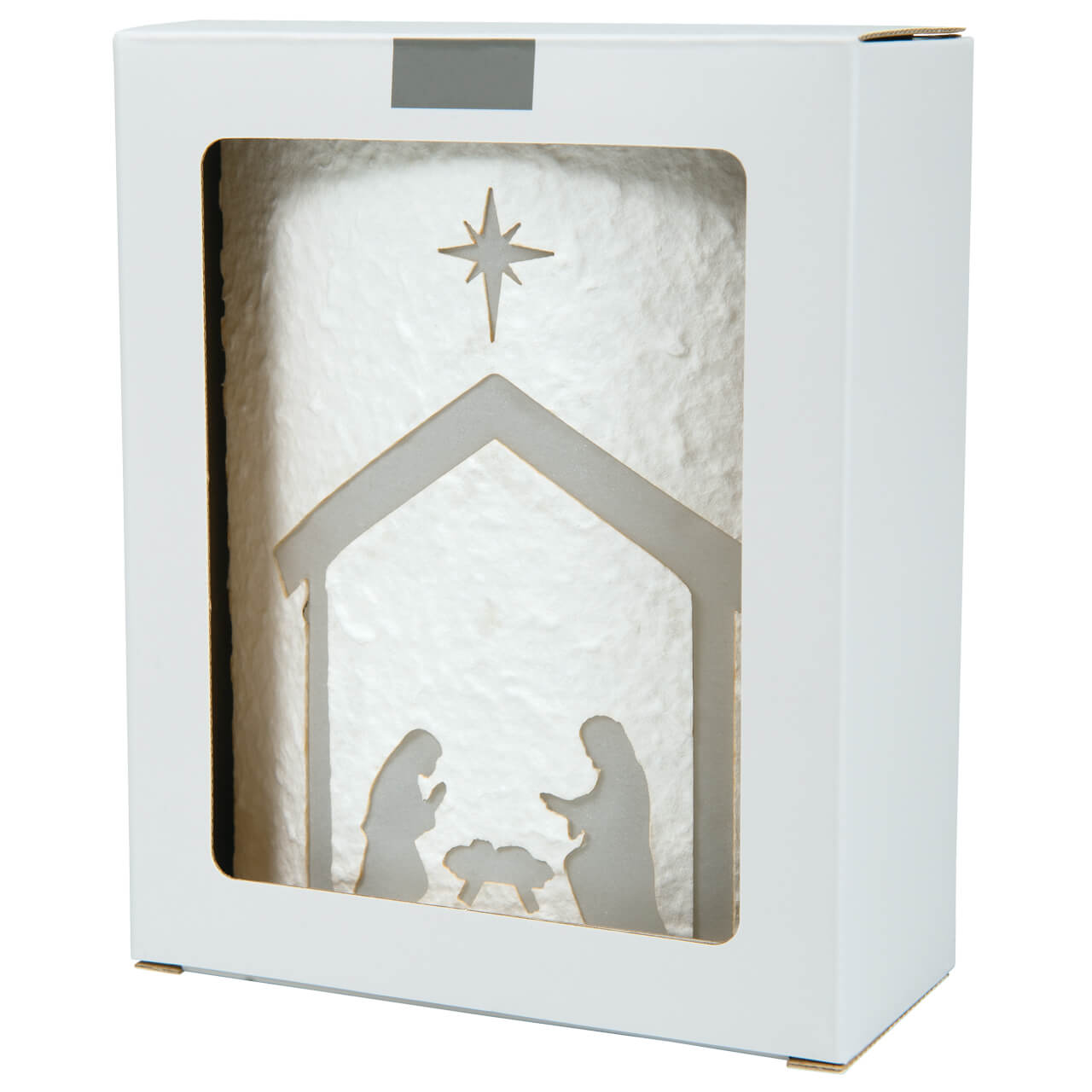 Schöne kleine LED-Papierlaterne Krippe aus weißem strukturierten Papier. Das Licht scheint durch das ausgesparte Krippenmotiv und verbreitet eine heimelige Atmosphäre auf Tisch, Regal oder Kommode.