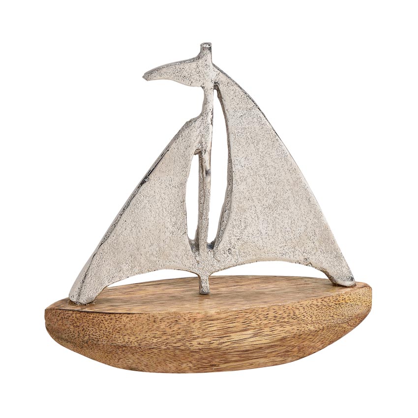 Diese schöne Dekofigur in Form eines Segelboots beeindruckt durch einen wunderbar harmonierenden Materialmix. Das leicht gebürstete Metall lässt einen angenehmen Kontrast zu dem glatten Rumpf aus Holz entstehen.