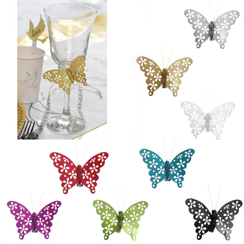 Deko Schmetterlinge aus Metall mit filigranem, floralen Muster. Ideal für kreative Bastelarbeiten, Tischdekorationen oder als zarter Blickfang an Gläsern, Pflanzen oder Geschenkverpackungen. Diese Schmetterlinge verleihen jeder Dekoration eine elegante und frühlingshafte Note.