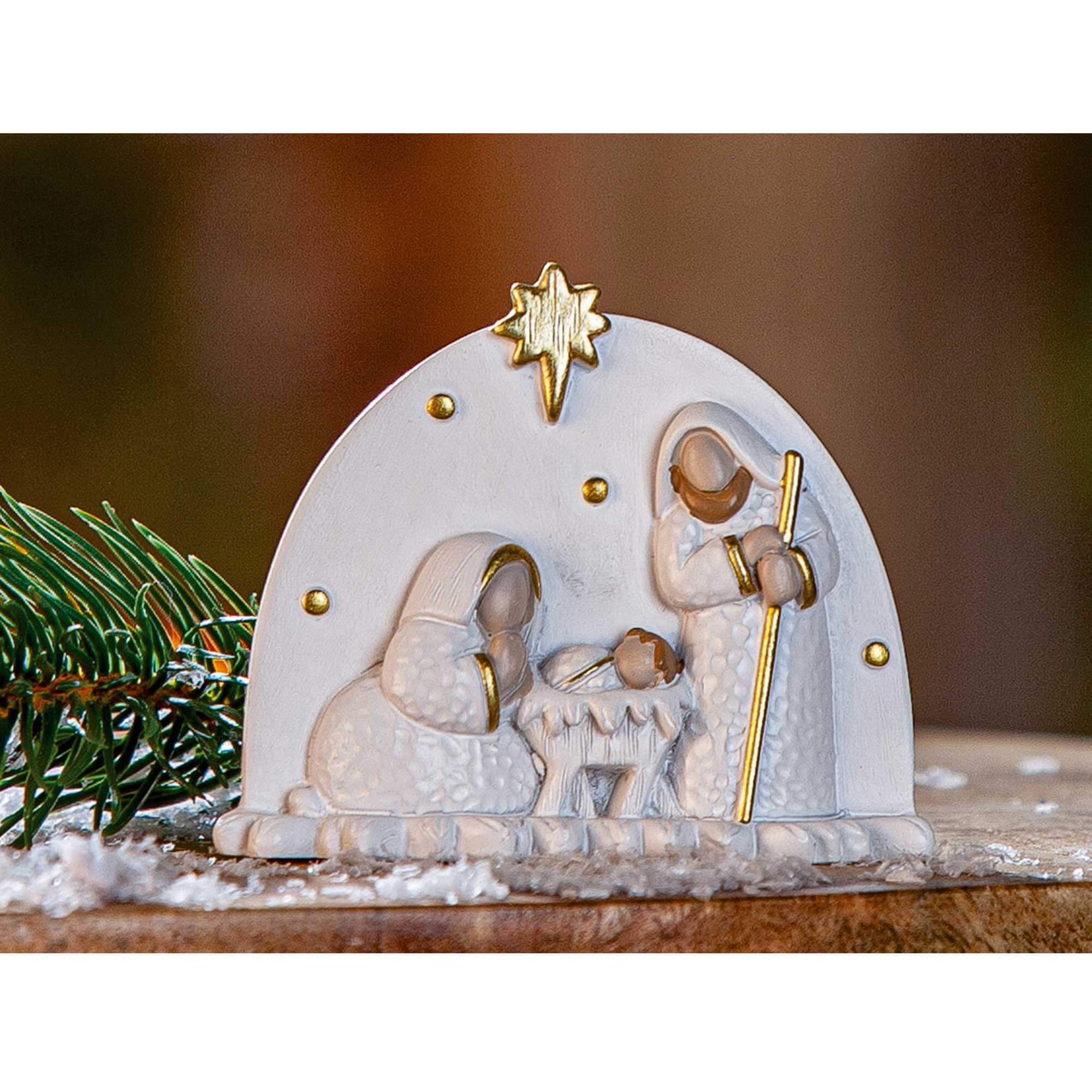 Die dekorative kleine Krippe vereint Tradition mit modernem Design und findet überall einen Platz. Ob auf der Fensterbank, im Regal oder auf dem Tisch, die weiße Krippe mit den goldfarbenen Verzierungen schafft schnell ein festliches Ambiente.
