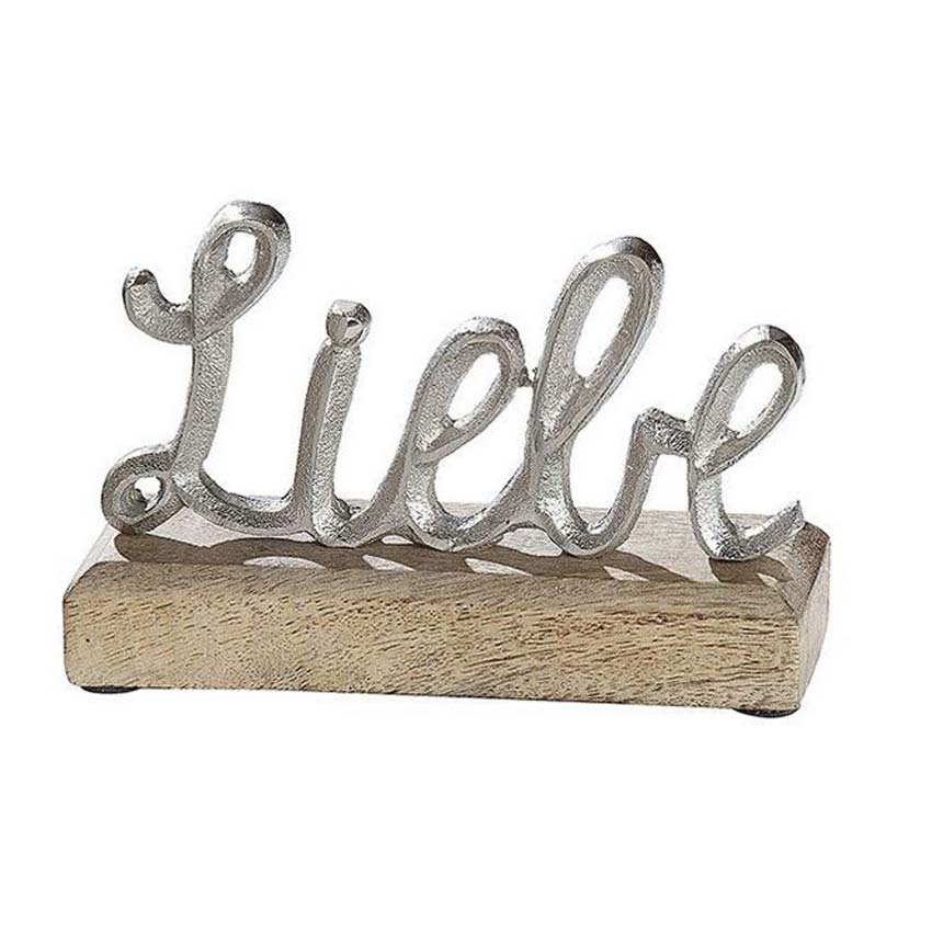 Eine kleine, liebe Dekoration ist dieser Aufsteller bestehend aus dem Wort Liebe. Der Schriftzug selbst ist aus silbernem Metall, in einer dekorativen Schreibschrift, gefertigt, welche auf einem 5,5cm tiefen Holzfuß sitzt.