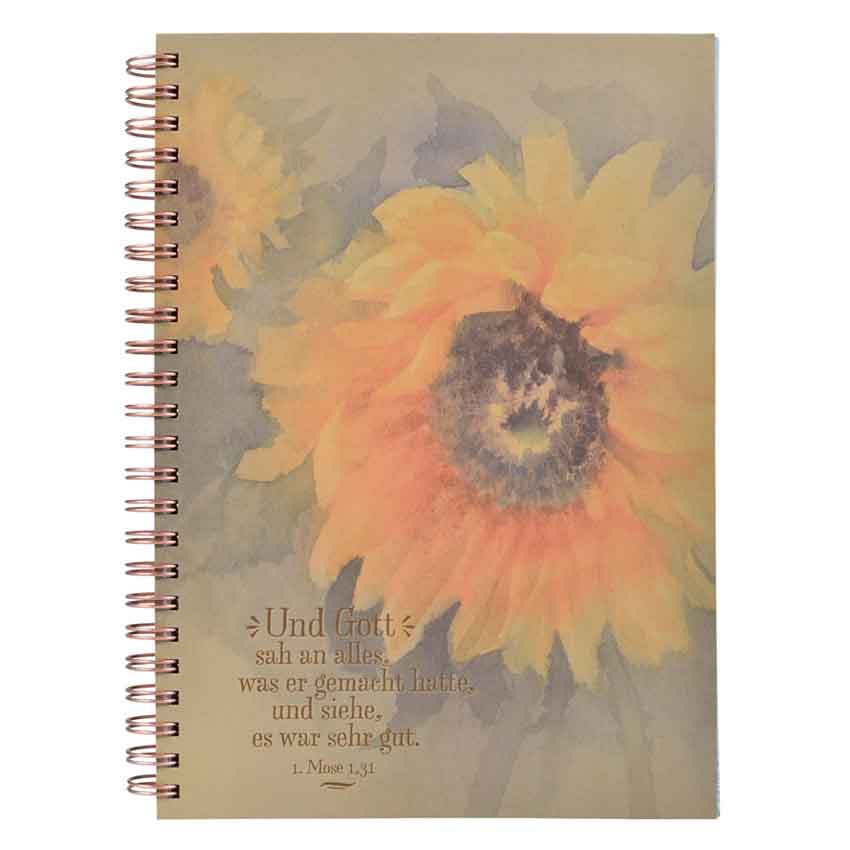 Dieser hübsche Notizblock ist eine nützliche und umweltbewußte Geschenkidee. Mit Sonnenblumen- Aquarellmotiv und schönem Bibelvers auf dem Deckblatt. Aus recyceltem Papier hergestellt.