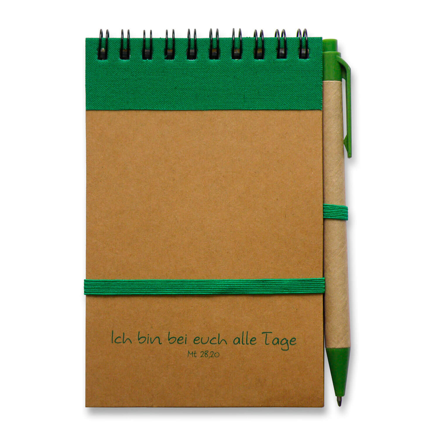 „Ich bin bei euch alle Tage Mt 28,20“, 14,5 cm, 70 Blatt liniert, teils aus recyceltem Material, Ringbindung, mit Kugelschreiber und elastischem Verschlussband