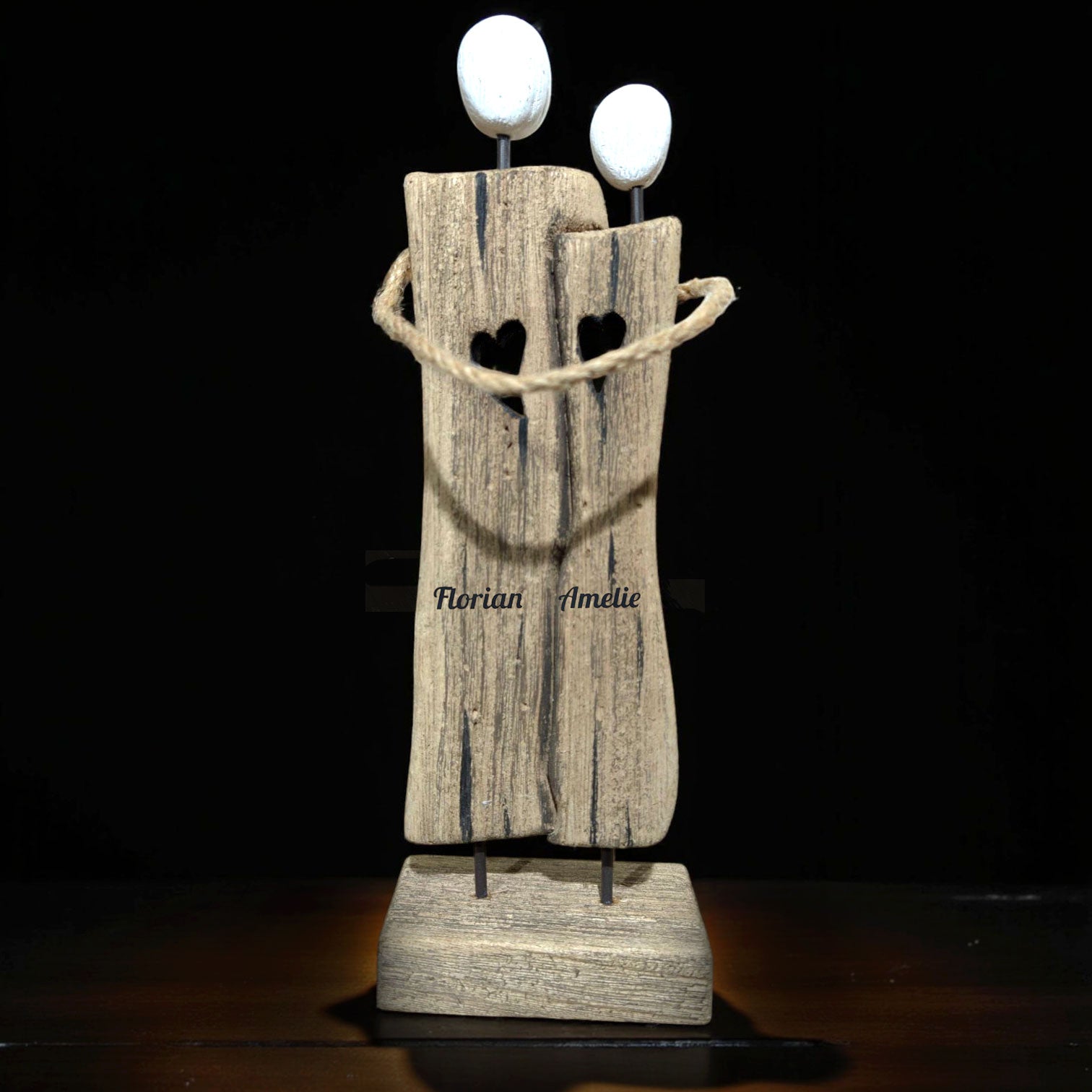 Diese dekorative Figur zeigt ein stilisiertes Paar mit Herz-Ausschnitt, das durch ein Juteseil verbunden ist. Das naturbelassene Holz kombiniert mit weißen Köpfen verleiht der Figur einen modernen und zugleich warmen Look.